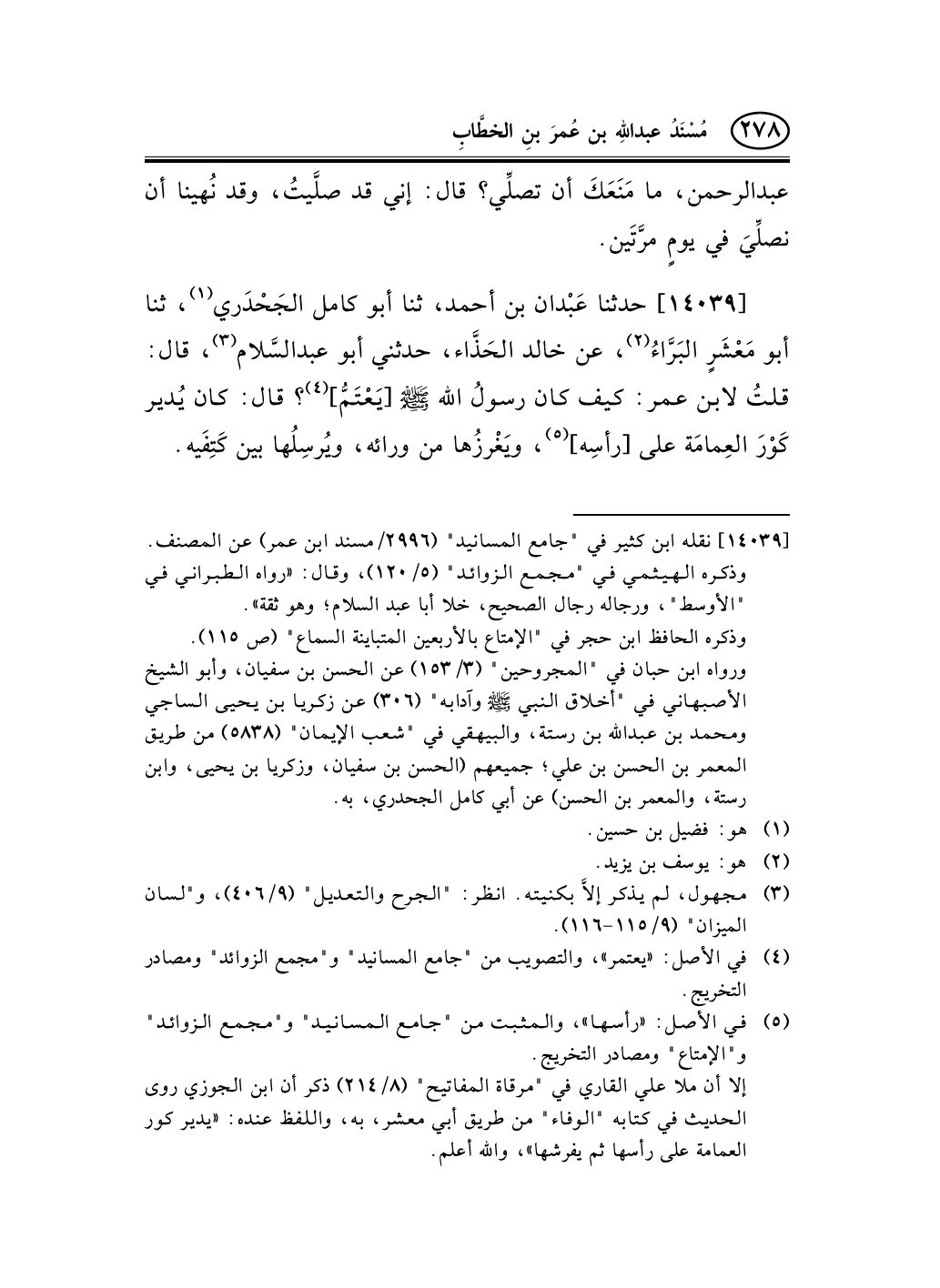 14039 - حدثنا عَبْدان بن أحمد، ثنا أبو كامل الجَحْدَري (¬1) ، ثنا أبو مَعْشَرٍ البَرَّاءُ (¬2) ، عن خالد الحَذَّاء، حدثني أبو عبد السَّلام (¬3) ، قال: قلتُ لابن عمر: كيف كان رسولُ الله صلى الله عليه وسلم [يَعْتَمُّ] (¬4) ؟ قال: كان يُدير كَوْرَ العِمامَة على [رأسِه] (¬5) ، ويَغْرزُها من ورائه، ويُرسِلُها بين كَتِفَيه.