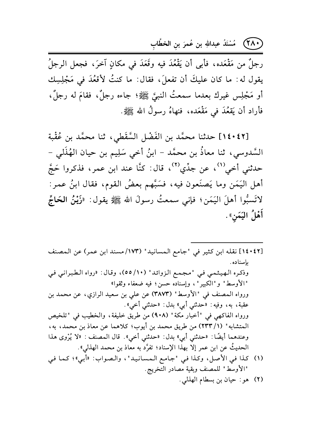 14042 - حدثنا محمَّد بن الفَضْل السَّقَطي، ثنا محمَّد بن عُقْبة السَّدوسي، ثنا معاذُ بن محمَّد - ابنُ أخي سَلِيم بن حيان الهُذَلي - حدثني أخي (¬1) ، عن جدِّي (¬2) ، قال: كنَّا عند ابن عمر، فذكروا حَجَّ أهل اليَمَن وما يَصنَعون فيه، فسَبَّهم بعضُ القوم، فقال ابنُ عمر: لاتَسبُّوا أهلَ اليَمَن؛ فإني سمعتُ رسولَ الله صلى الله عليه وسلم يقول: «زَيْنُ الحَاجِّ أَهْلُ اليَمَنِ» .