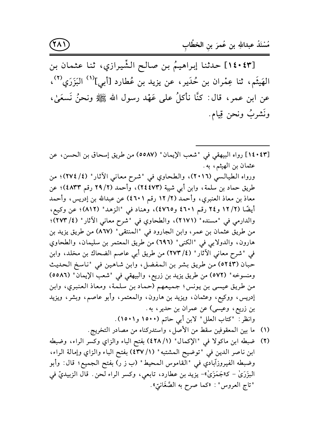 14043 - حدثنا إبراهيمُ بن صالح الشِّيرازي، ثنا عثمان بن الهَيثَم، ثنا عِمْران بن حُدَير، عن يزيد بن عُطارد [أبي] (¬1) البَزَرَي (¬2) ، عن ابن عمر، قال: كنَّا نأكلُ على عَهْد رسول الله صلى الله عليه وسلم ونحنُ نَسعَى، ونَشربُ ونحن قِيام.