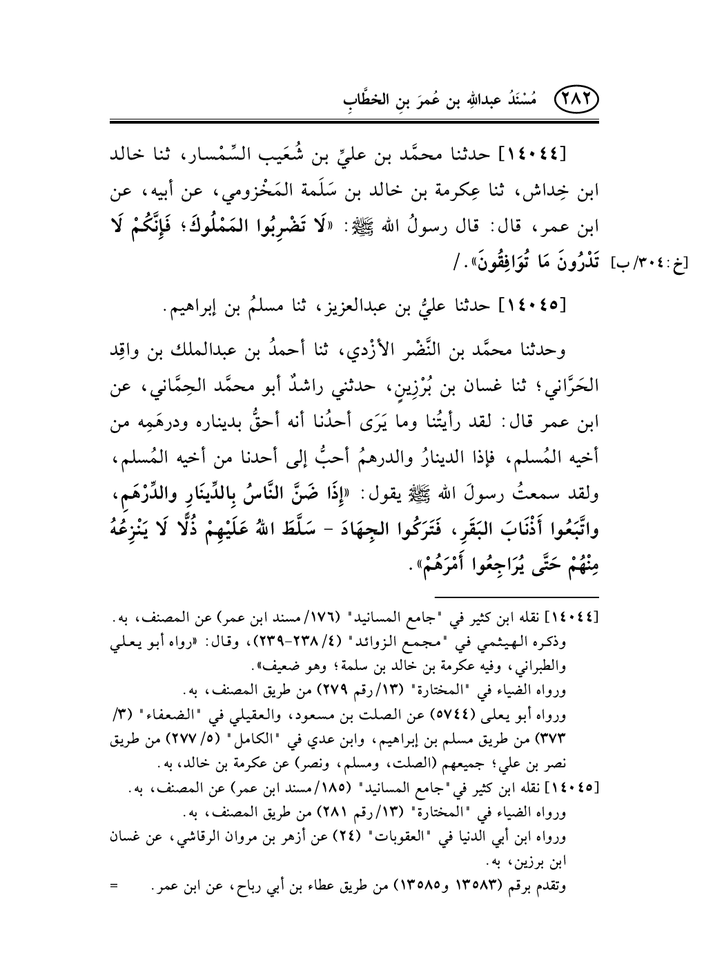 وحدثنا محمَّد بن النَّضْر الأزْدي، ثنا أحمدُ بن عبد الملك بن واقِد الحَرَّاني؛ ثنا غسان بن بُرْزِينٍ، حدثني راشدٌ أبو محمَّد الحِمَّاني، عن ابن عمر قال: لقد رأيتُنا وما يَرَى أحدُنا أنه أحقُّ بديناره ودرهَمِه من أخيه المُسلم، فإذا الدينارُ والدرهمُ أحبُّ إلى أحدنا من أخيه المُسلم، ولقد سمعتُ رسولَ الله صلى الله عليه وسلم يقول: «إِذَا ضَنَّ النَّاسُ بِالدِّينَارِ والدِّرْهَمِ، واتَّبَعُوا أَذْنَابَ البَقَرِ، فَتَرَكُوا الجِهَادَ - سَلَّطَ اللهُ عَلَيْهِمْ ذُلًّا لاَ يَنْزِعُهُ مِنْهُمْ حَتَّى يُرَاجِعُوا أَمْرَهُمْ» .