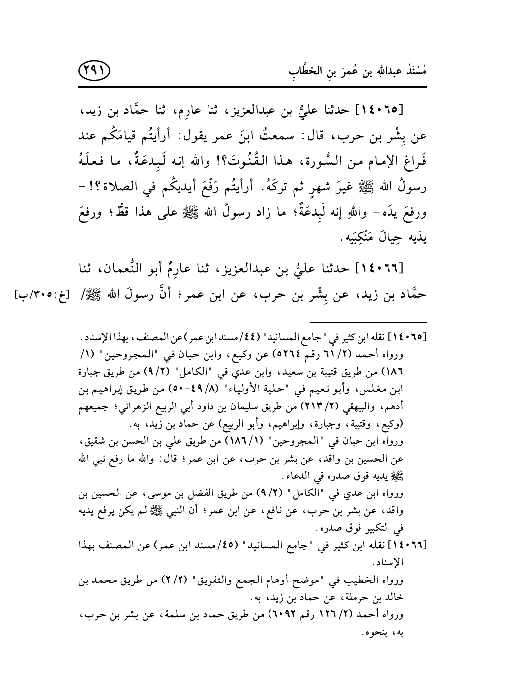 14065 - حدثنا عليُّ بن عبد العزيز، ثنا عارِم، ثنا حمَّاد بن زيد، عن بِشْر بن حرب، قال: سمعتُ ابنَ عمر يقول: أرأيتُم قيامَكُم عند فَراغ الإمام من السُّورة، هذا القُنُوتَ؟! والله إنه لَبِدعَةٌ، ما فعلَهُ رسولُ الله صلى الله عليه وسلم غيرَ شهرٍ ثم تركَهُ. أرأيتُم رَفْعَ أيديكُم في الصلاة؟! - ورفعَ يدَه - واللهِ إنه لَبِدعَةٌ؛ ما زاد رسولُ الله صلى الله عليه وسلم على هذا قطُّ؛ ورفعَ يدَيه حِيالَ مَنْكِبَيه.