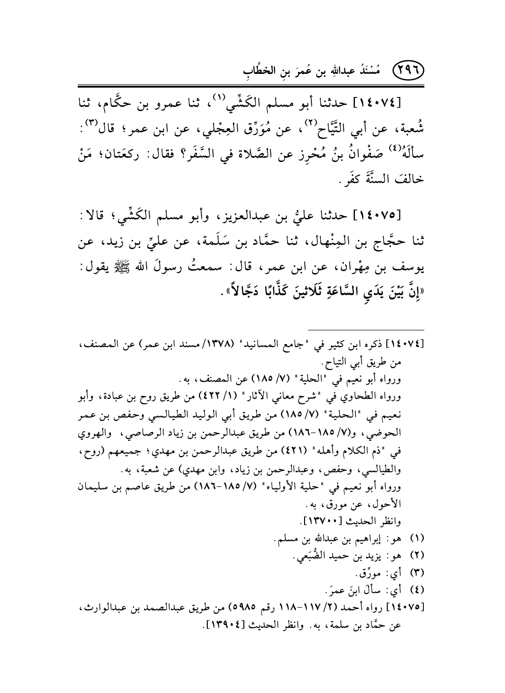 14074 - حدثنا أبو مسلم الكَشِّي (¬1) ، ثنا عمرو بن حكَّام، ثنا شُعبة، عن أبي التَّيَّاح (¬2) ، عن مُوَرِّق العِجْلي، عن ابن عمر؛ قال (¬3) : سألَهُ (¬4) صَفْوانُ بنُ مُحْرِز عن الصَّلاة في السَّفَر؟ فقال: ركعَتان؛ مَنْ خالفَ السنَّةَ كفَر.