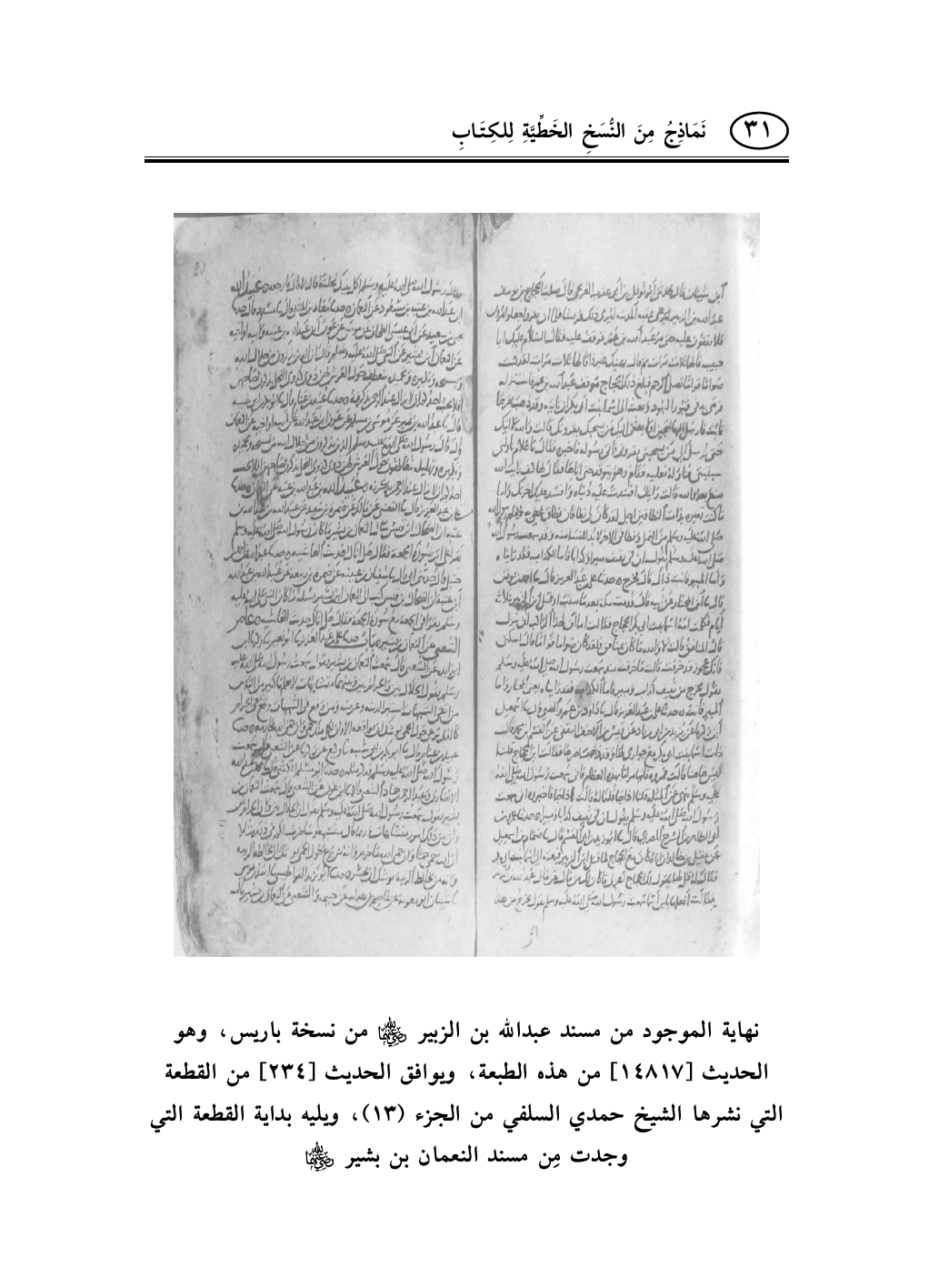 نهاية الموجود من مسند عبد الله بن الزبير رضي الله عنهما من نسخة باريس، وهو الحديث [14817] من هذه الطبعة، ويوافق الحديث [234] من القطعة التي نشرها الشيح حمدي السلفي من الجزء (13) ، ويليه بداية القطعة التي وجدت مِن مسند النعمان بن بشير رضي الله عنهما