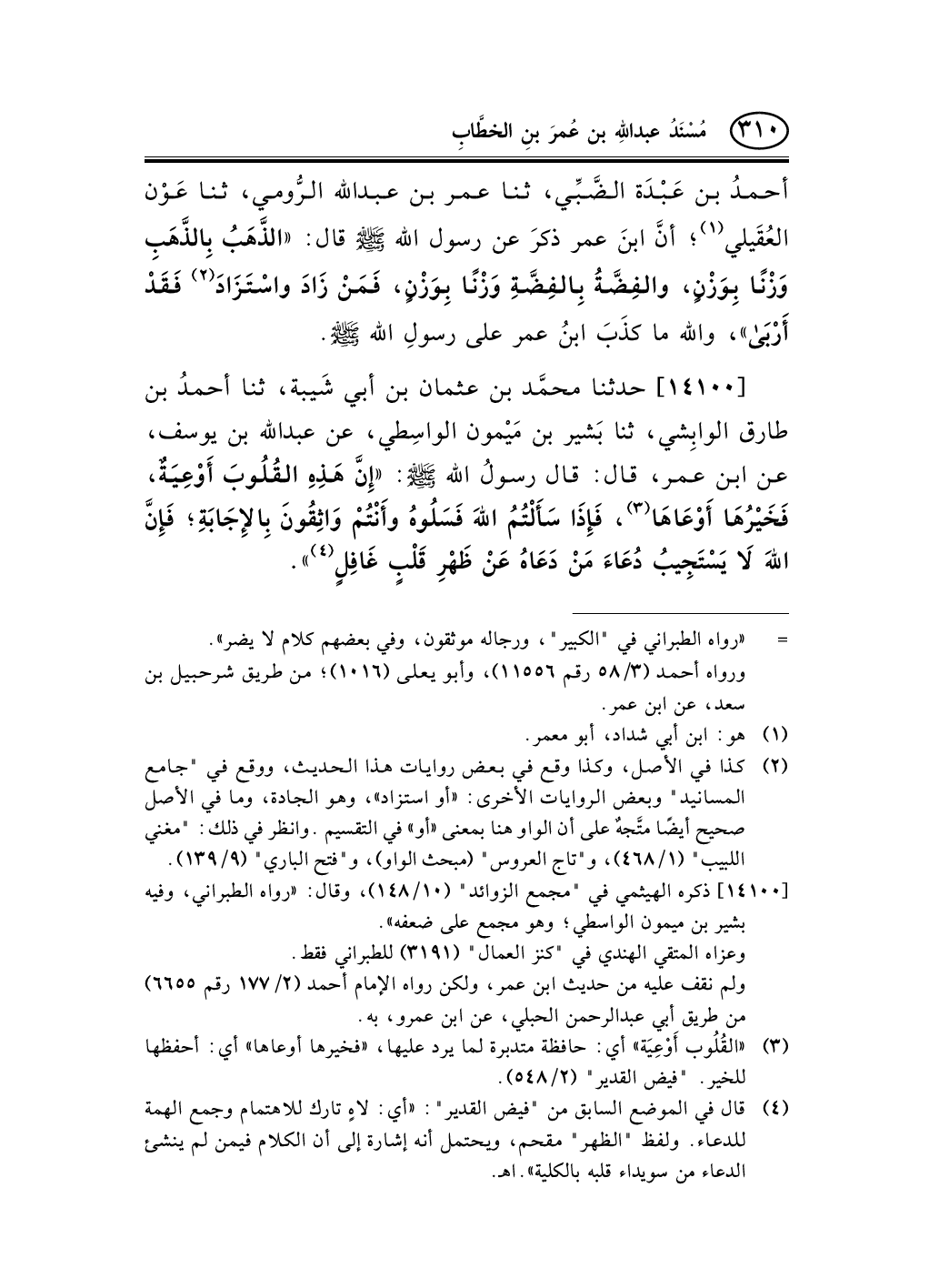 14100 - حدثنا محمَّد بن عثمان بن أبي شَيبة، ثنا أحمدُ بن طارق الوابِشي، ثنا بَشير بن مَيْمون الواسِطي، عن عبد الله بن يوسف، عن ابن عمر، قال: قال رسولُ الله صلى الله عليه وسلم: «إِنَّ هَذِهِ القُلُوبَ أَوْعِيَةٌ، فَخَيْرُهَا أَوْعَاهَا (¬1) ، فَإِذَا سَأَلْتُمُ اللهَ فَسَلُوهُ وأَنْتُمْ وَاثِقُونَ بِالإِجَابَةِ؛ فَإِنَّ اللهَ لاَ يَسْتَجِيبُ دُعَاءَ مَنْ دَعَاهُ عَنْ ظَهْرِ قَلْبٍ غَافِلٍ (¬2) » .