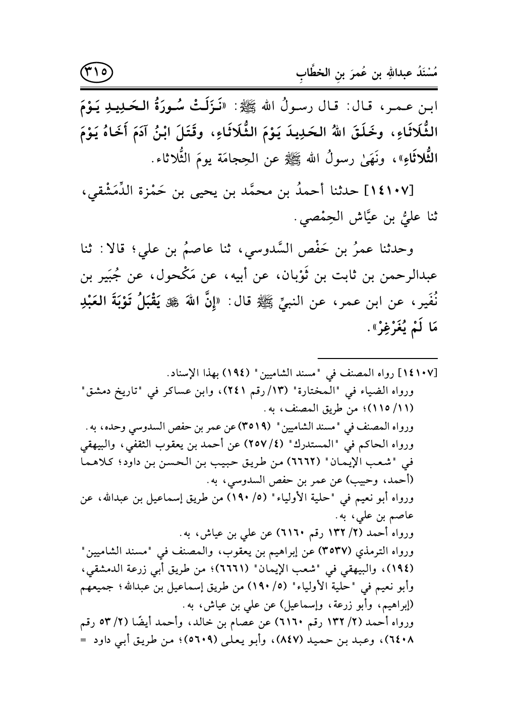 14107 - حدثنا أحمدُ بن محمَّد بن يحيى بن حَمْزة الدِّمَشْقي، ثنا عليُّ بن عيَّاش الحِمْصي.