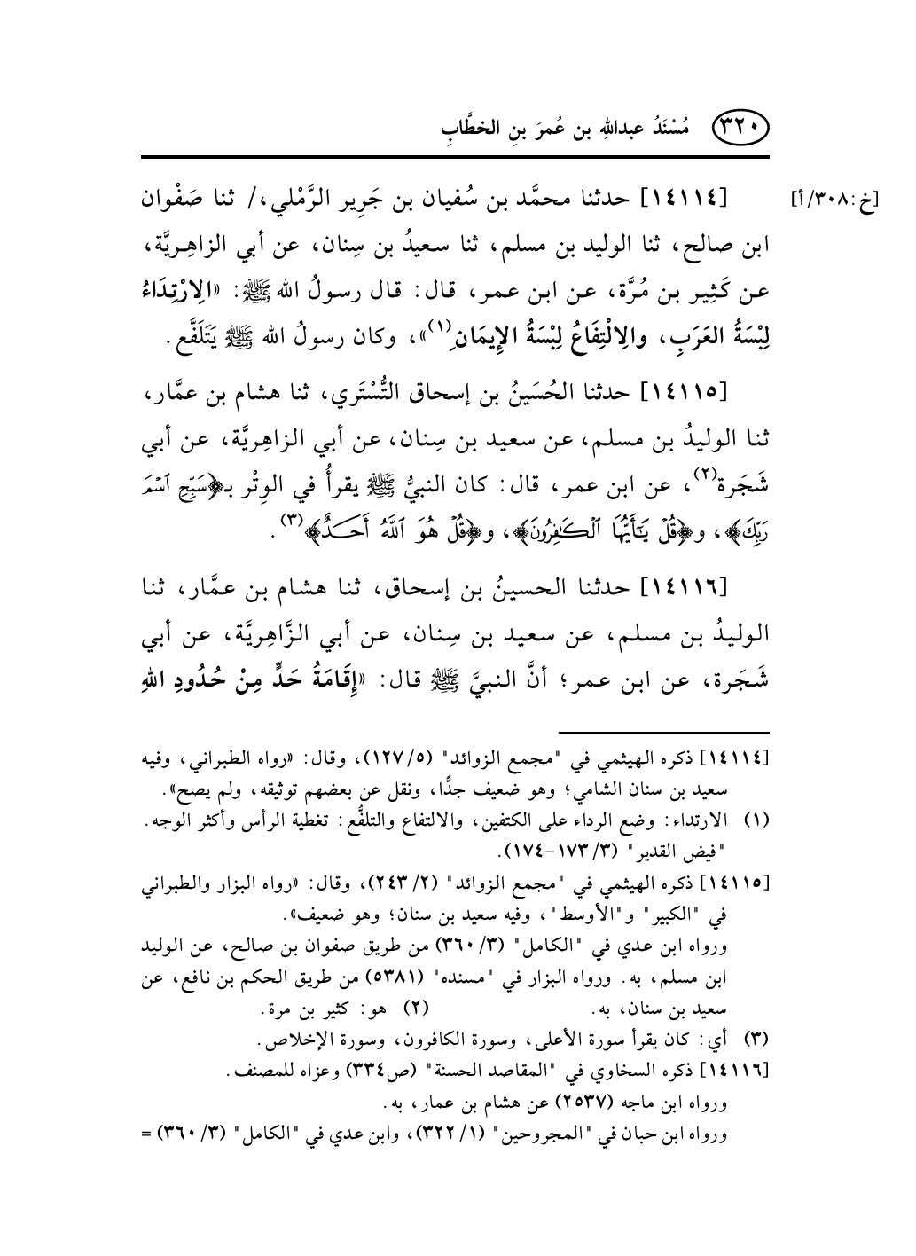 14114 - حدثنا محمَّد بن سُفيان بن جَرِير الرَّمْلي، / ثنا صَفْوان ابن صالح، ثنا الوليد بن مسلم، ثنا سعيدُ بن سِنان، عن أبي الزاهِريَّة، عن كَثِير بن مُرَّة، عن ابن عمر، قال: قال رسولُ الله صلى الله عليه وسلم: «الاِرْتِدَاءُ لِبْسَةُ العَرَبِ، والاِلْتِفَاعُ لِبْسَةُ الإِيمَانِ (¬1) » ، وكان رسولُ الله صلى الله عليه وسلم يَتَلَفَّع.