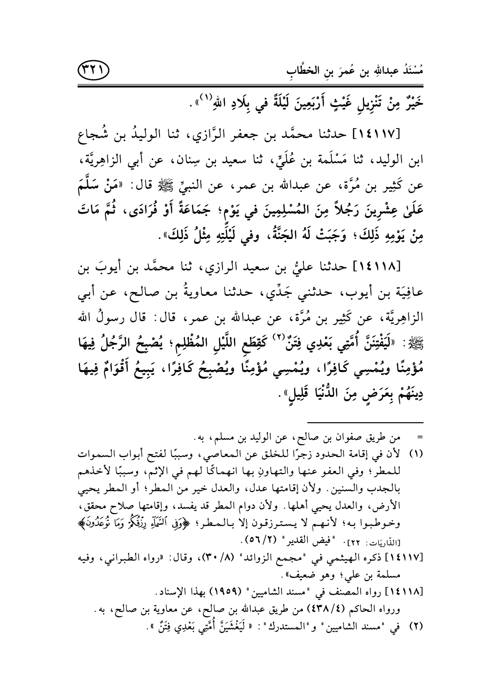 14118 - حدثنا عليُّ بن سعيد الرازي، ثنا محمَّد بن أيوبَ بن عافِيَة بن أيوب، حدثني جَدِّي، حدثنا معاويةُ بن صالح، عن أبي الزاهِريَّة، عن كَثِير بن مُرَّة، عن عبد الله بن عمر، قال: قال رسولُ الله صلى الله عليه وسلم: «لَيَفْتِنَنَّ أُمَّتِي بَعْدِي فِتَنٌ (¬1) كَقِطَعِ اللَّيْلِ المُظْلِمِ؛ يُصْبِحُ الرَّجُلُ فِيهَا مُؤْمِنًا ويُمْسِي كَافِرًا، ويُمْسِي مُؤْمِنًا ويُصْبِحُ كَافِرًا، يَبِيعُ أَقْوَامٌ فِيهَا دِينَهُمْ بِعَرَضٍ مِنَ الدُّنْيَا قَلِيلٍ» .