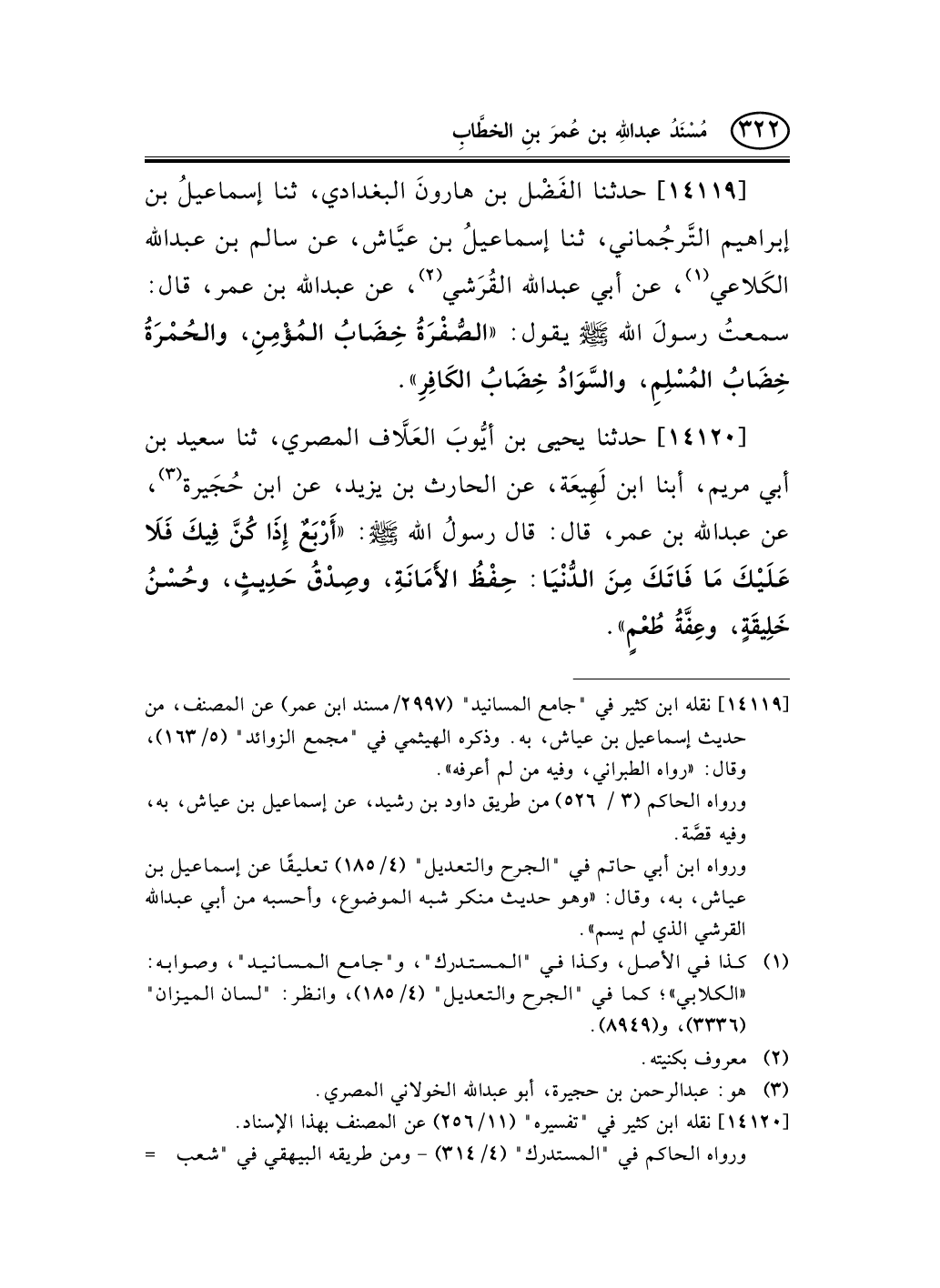 14119 - حدثنا الفَضْل بن هارونَ البغدادي، ثنا إسماعيلُ بن إبراهيم التَّرجُماني، ثنا إسماعيلُ بن عيَّاش، عن سالم بن عبد الله الكَلاعي (¬1) ، عن أبي عبد الله القُرَشي (¬2) ، عن عبد الله بن عمر، قال: سمعتُ رسولَ الله صلى الله عليه وسلم يقول: «الصُّفْرَةُ خِضَابُ المُؤْمِنِ، والحُمْرَةُ خِضَابُ المُسْلِمِ، والسَّوَادُ خِضَابُ الكَافِرِ» .