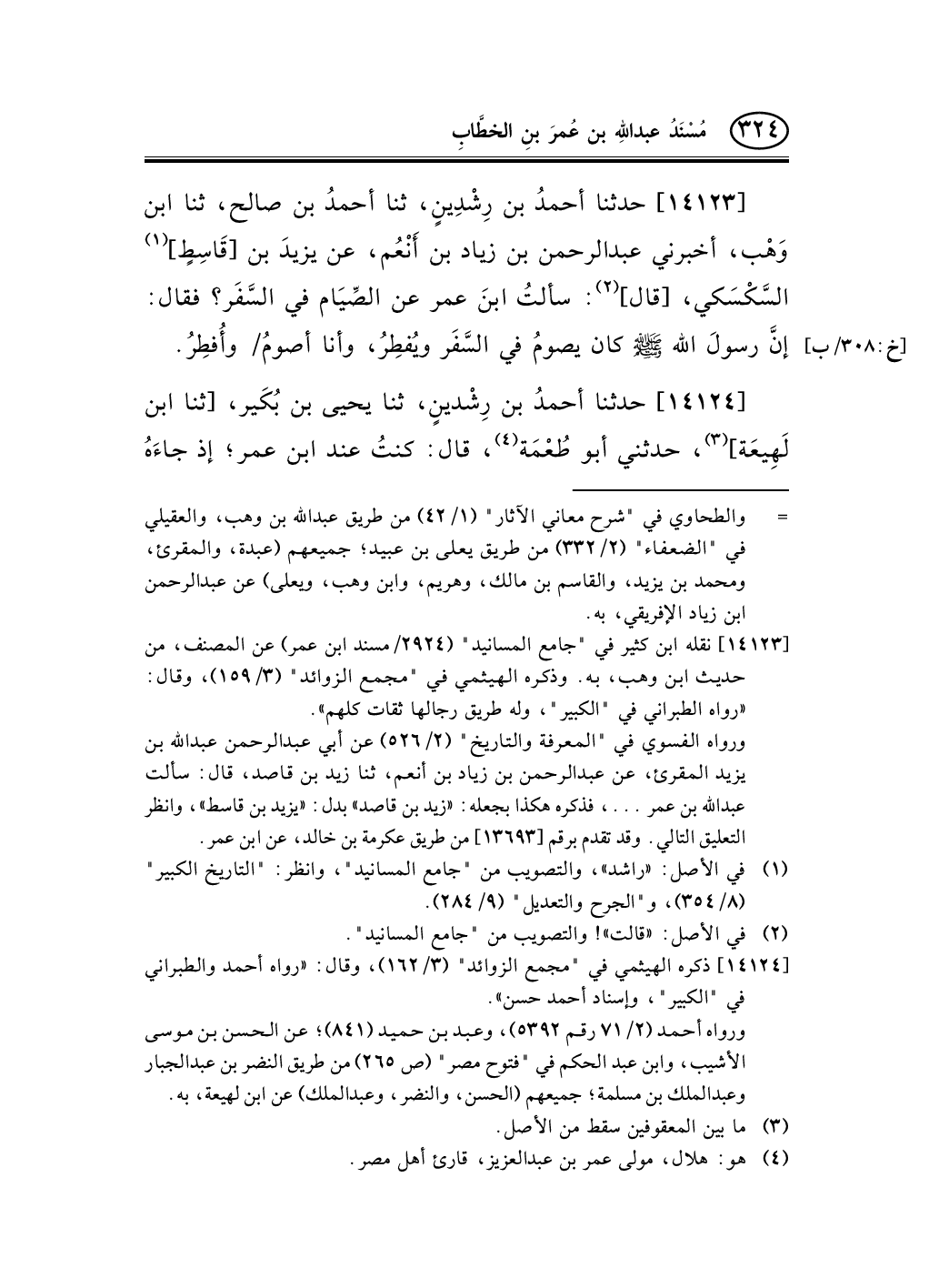 14123 - حدثنا أحمدُ بن رِشْدِينٍ، ثنا أحمدُ بن صالح، ثنا ابن وَهْب، أخبرني عبد الرحمن بن زياد بن أَنْعُم، عن يزيدَ بن [قَاسِطٍ] (¬1) السَّكْسَكي، [قال] (¬2) : سألتُ ابنَ عمر عن الصِّيَام في السَّفَر؟ فقال: إنَّ رسولَ الله صلى الله عليه وسلم كان يصومُ في السَّفَر ويُفطِرُ، وأنا أصومُ/ وأُفطِرُ.