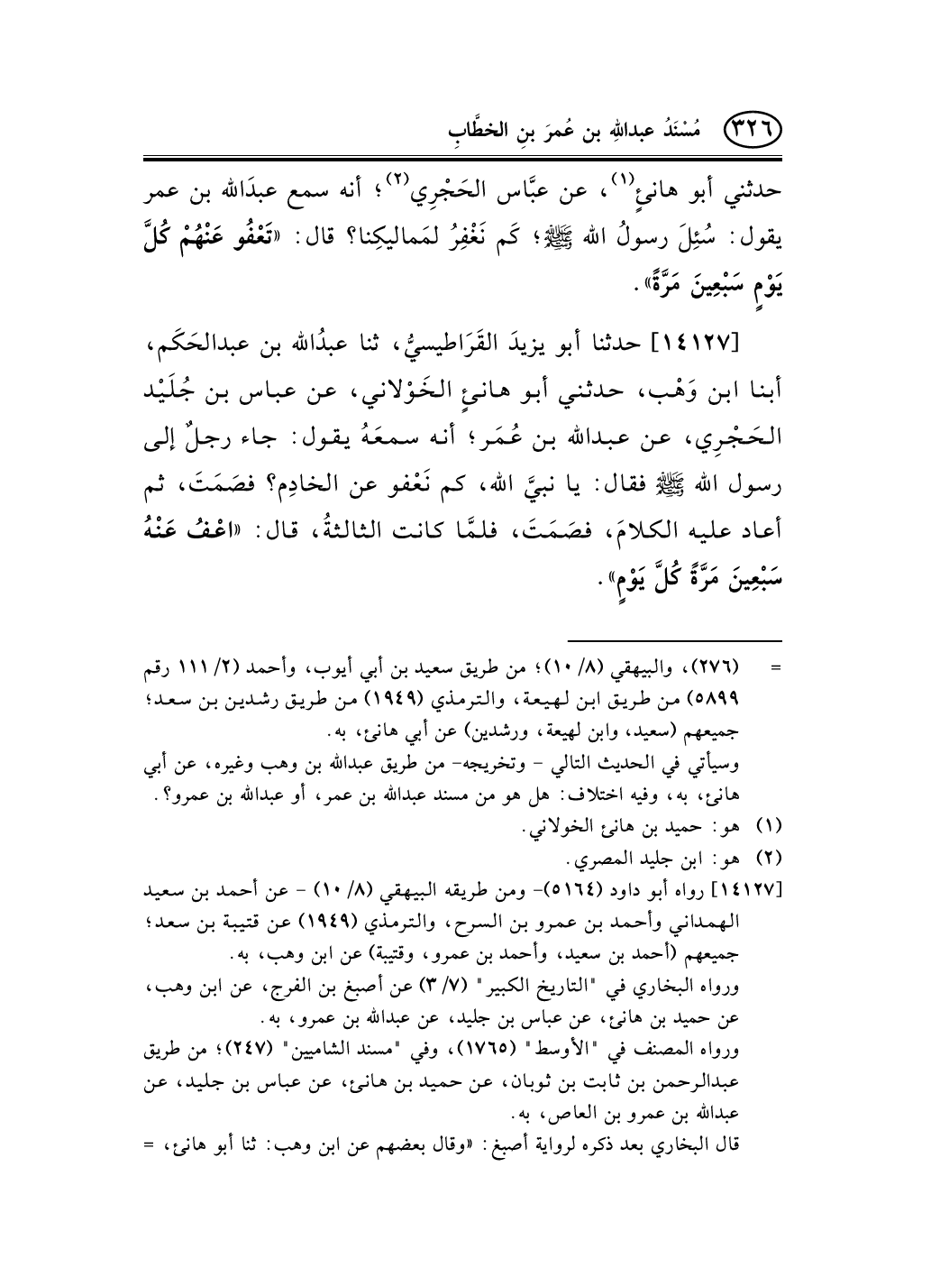 14127 - حدثنا أبو يزيدَ القَرَاطيسيُّ، ثنا عبدُالله بن عبد الحَكَم، أبنا ابن وَهْب، حدثني أبو هانئٍ الخَوْلاني، عن عباس بن جُلَيْد الحَجْرِي، عن عبد الله بن عُمَر؛ أنه سمعَهُ يقول: جاء رجلٌ إلى رسول الله صلى الله عليه وسلم فقال: يا نبيَّ الله، كم نَعْفو عن الخادِم؟ فصَمَتَ، ثم أعاد عليه الكلامَ، فصَمَتَ، فلمَّا كانت الثالثةُ، قال: «اعْفُ عَنْهُ سَبْعِينَ مَرَّةً كُلَّ يَوْمٍ» .