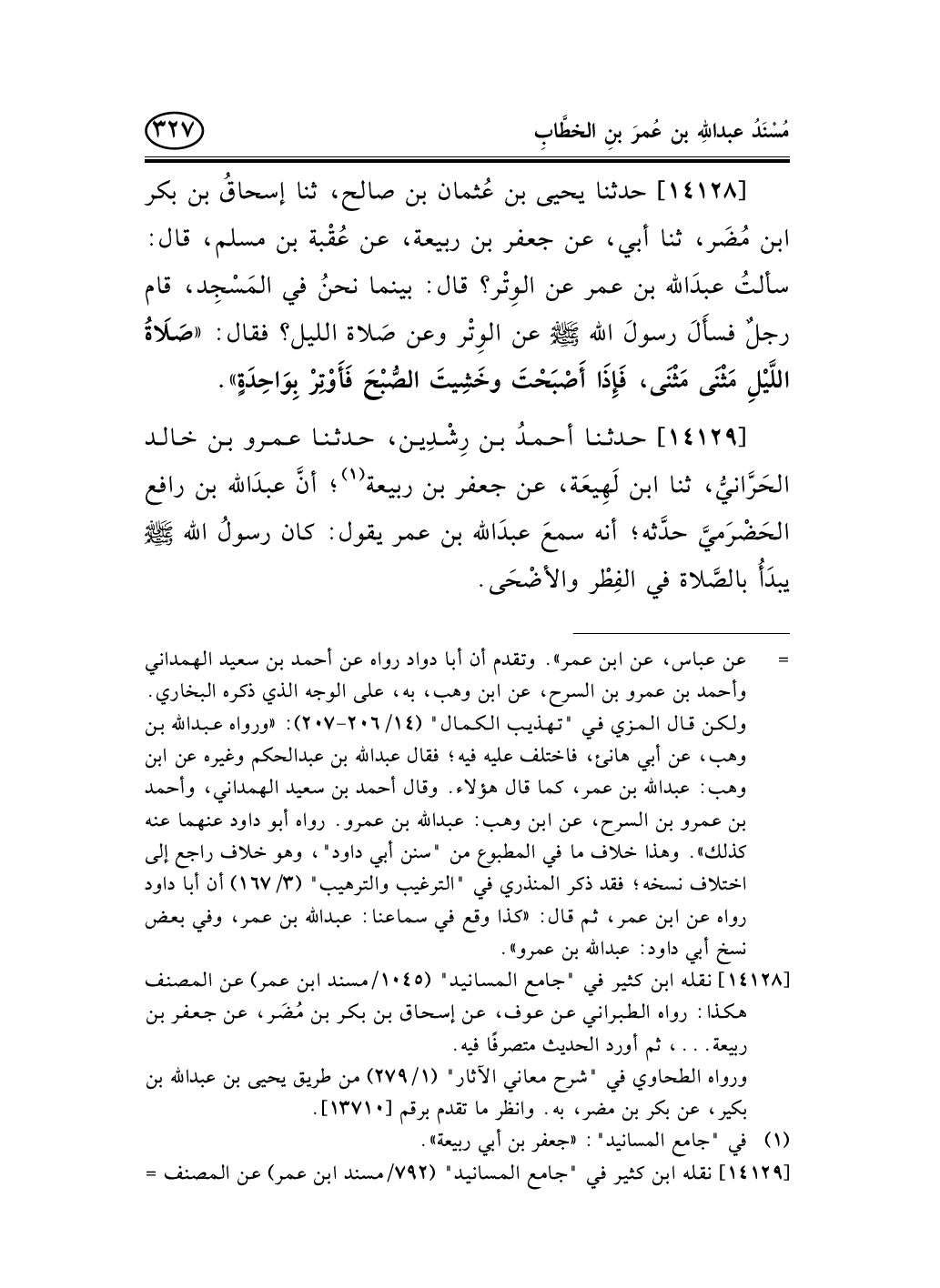 [14128] نقله ابن كثير في "جامع المسانيد" (1045/مسند ابن عمر) عن المصنف هكذا: رواه الطبراني عن عوف، عن إسحاق بن بكر بن مُضَر، عن جعفر بن ربيعة ... ، ثم أورد الحديث متصرفًا فيه.