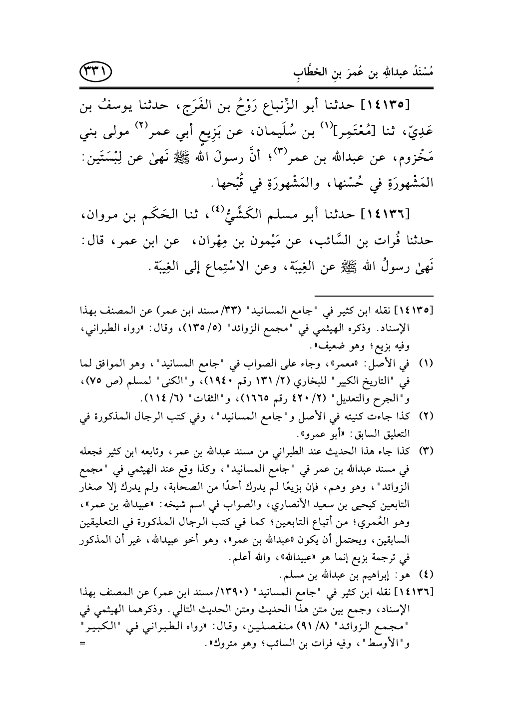 [14135] نقله ابن كثير في "جامع المسانيد" (33/مسند ابن عمر) عن المصنف بهذا الإسناد. وذكره الهيثمي في "مجمع الزوائد" (5/135) ، وقال: «رواه الطبراني، وفيه بزيع؛ وهو ضعيف» .
