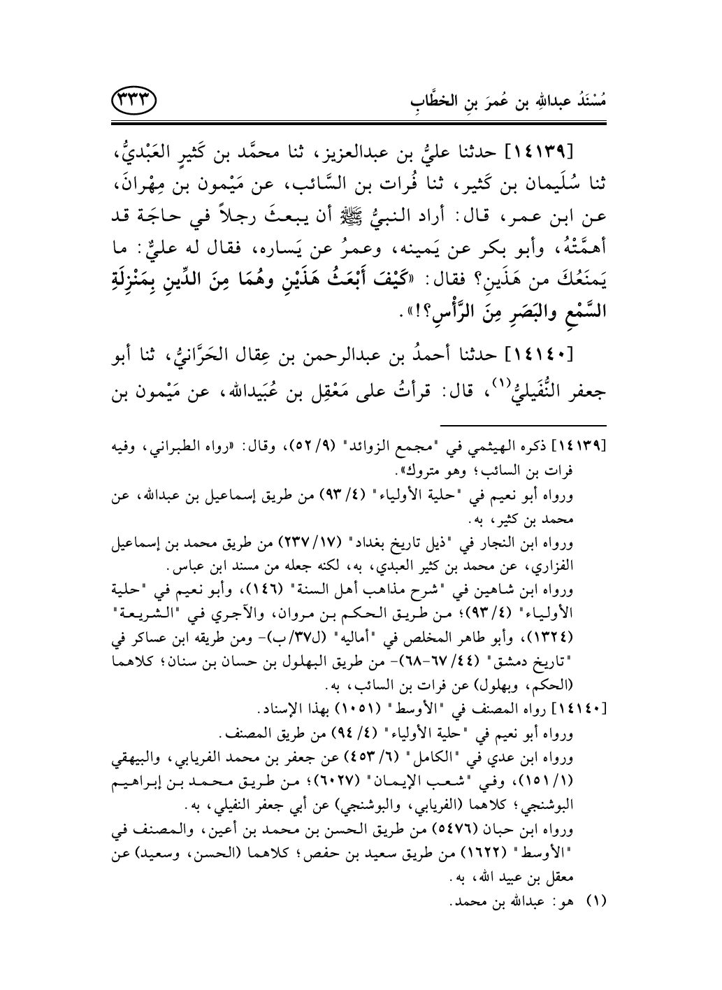 14139 - حدثنا عليُّ بن عبد العزيز، ثنا محمَّد بن كَثيرٍ العَبْديُّ، ثنا سُلَيمان بن كَثير، ثنا فُرات بن السَّائب، عن مَيْمون بن مِهْرانَ، عن ابن عمر، قال: أراد النبيُّ صلى الله عليه وسلم أن يبعثَ رجلاً في حاجَة قد أهمَّتْهُ، وأبو بكر عن يَمينه، وعمرُ عن يَساره، فقال له عليٌّ: ما يَمنَعُكَ من هَذَينِ؟ فقال: «كَيْفَ أَبْعَثُ هَذَيْنِ وهُمَا مِنَ الدِّينِ بِمَنْزِلَةِ السَّمْعِ والبَصَرِ مِنَ الرَّأْسِ؟!» .