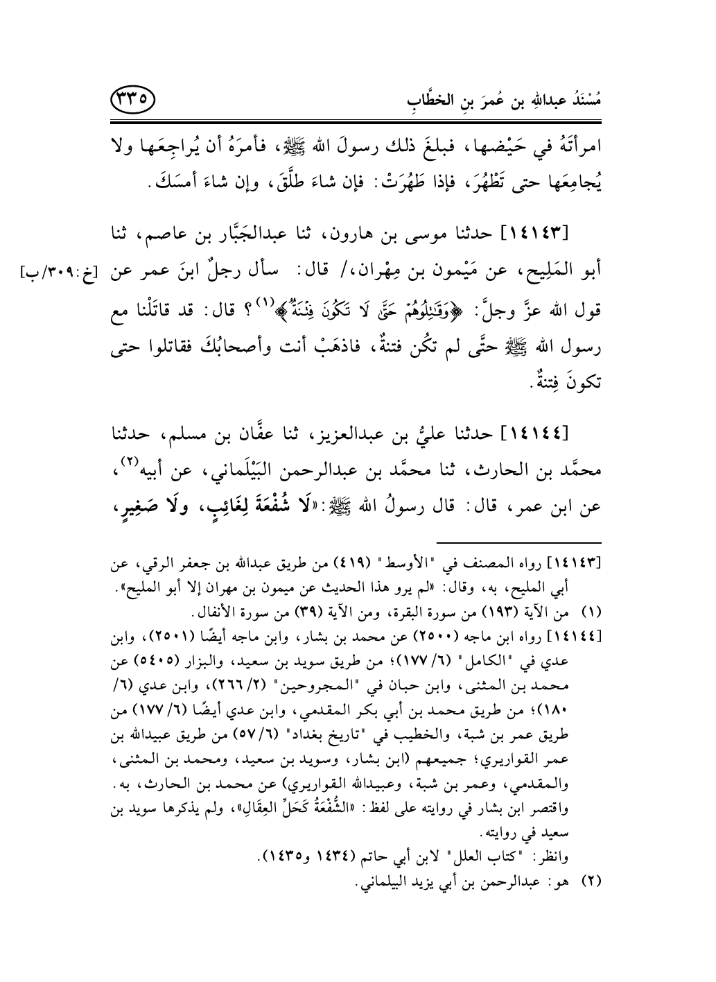 14143 - حدثنا موسى بن هارون، ثنا عبد الجَبَّار بن عاصم، ثنا أبو المَلِيح، عن مَيْمون بن مِهْران، / قال: سأل رجلٌ ابنَ عمر عن [خ: 309/ب]