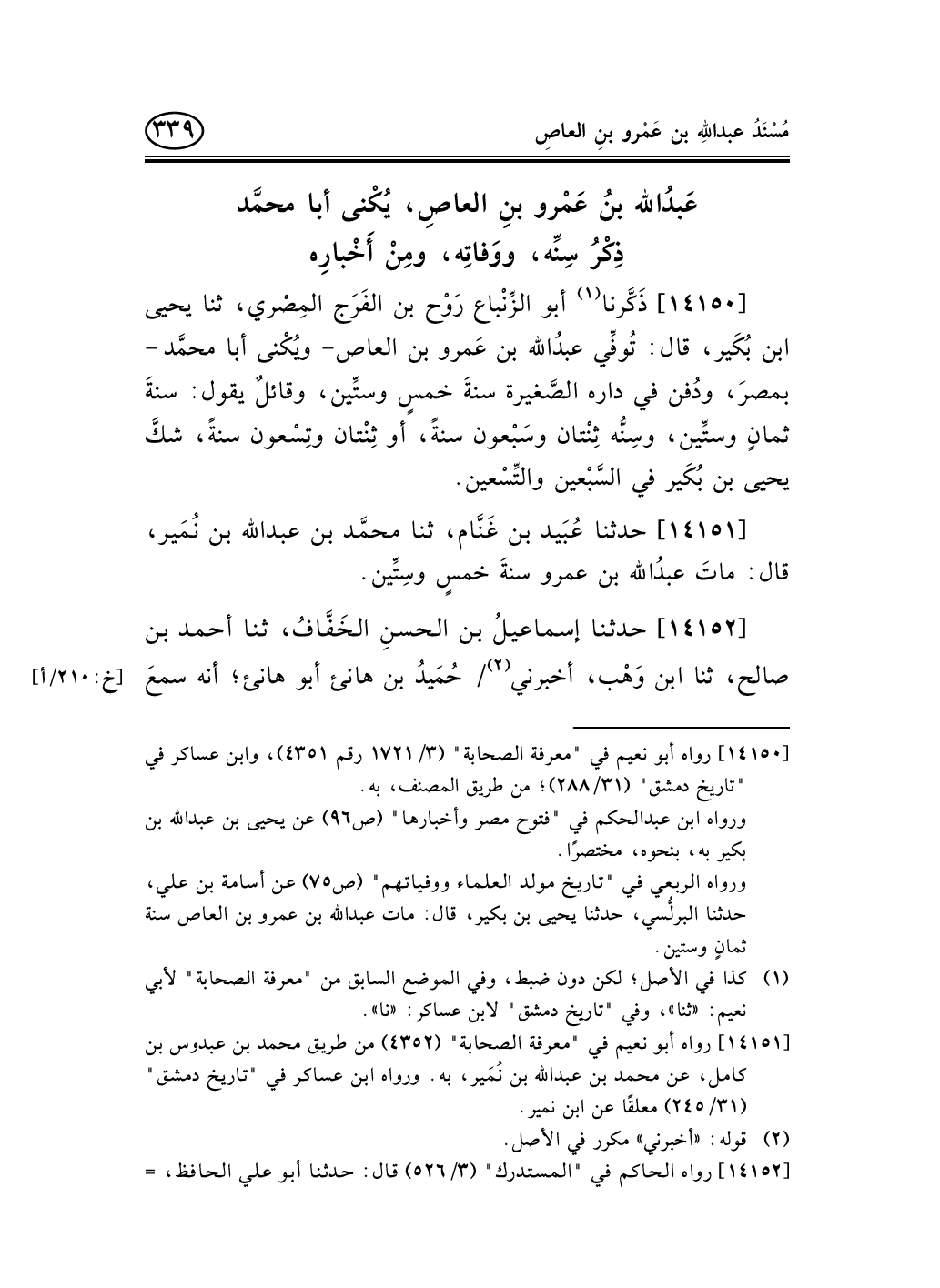 14150 - ذَكَّرنا (¬1) أبو الزِّنْباع رَوْح بن الفَرَج المِصْري، ثنا يحيى ابن بُكَير، قال: تُوفِّي عبدُالله بن عَمرو بن العاص- ويُكْنى أبا محمَّد - بمصرَ، ودُفن في داره الصَّغيرة سنةَ خمسٍ وستِّين، وقائلٌ يقول: سنةَ ثمانٍ وستِّين، وسِنُّه ثِنْتان وسَبْعون سنةً، أو ثِنْتان وتِسْعون سنةً، شكَّ يحيى بن بُكَير في السَّبْعين والتِّسْعين.