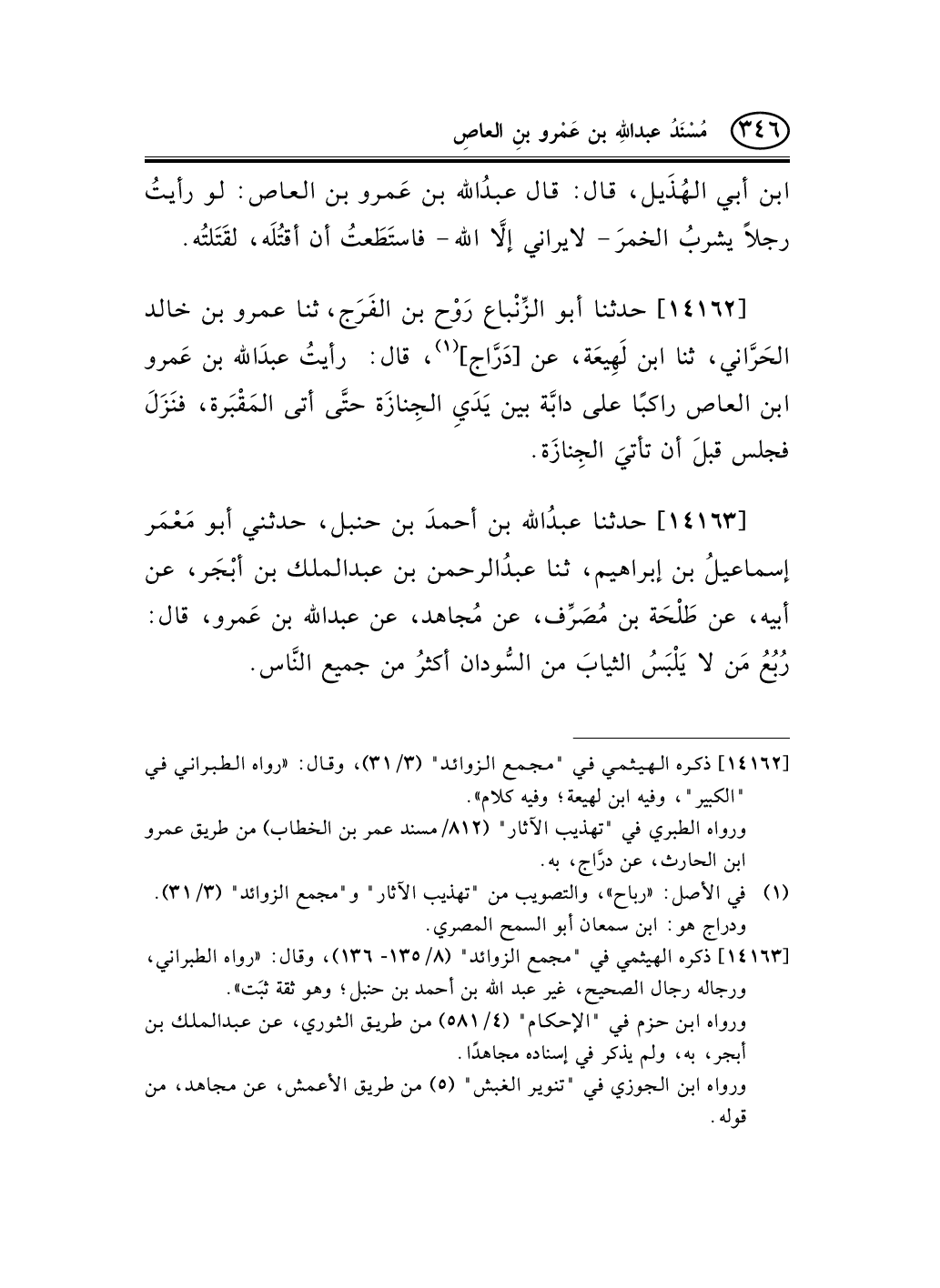 14163 - حدثنا عبدُالله بن أحمدَ بن حنبل، حدثني أبو مَعْمَر إسماعيلُ بن إبراهيم، ثنا عبدُالرحمن بن عبد الملك بن أبْجَر، عن أبيه، عن طَلْحَة بن مُصَرِّف، عن مُجاهد، عن عبد الله بن عَمرو، قال: رُبُعُ مَن لا يَلْبَسُ الثيابَ من السُّودان أكثرُ من جميع النَّاس.