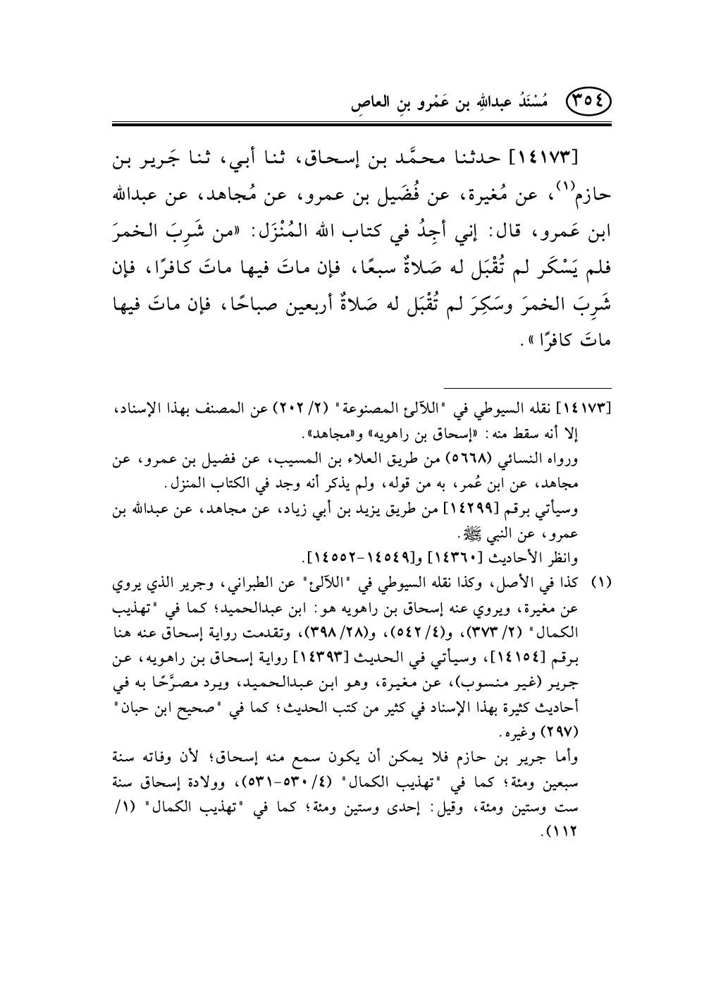 14173 - حدثنا محمَّد بن إسحاق، ثنا أبي، ثنا جَرير بن حازم (¬1) ، عن مُغيرة، عن فُضَيل بن عمرو، عن مُجاهد، عن عبد الله ابن عَمرو، قال: إني أجِدُ في كتاب الله المُنْزَل: «من شَرِبَ الخمرَ فلم يَسْكَر لم تُقْبَل له صَلاةٌ سبعًا، فإن ماتَ فيها ماتَ كافرًا، فإن شَرِبَ الخمرَ وسَكِرَ لم تُقْبَل له صَلاةٌ أربعين صباحًا، فإن ماتَ فيها ماتَ كافرًا» .