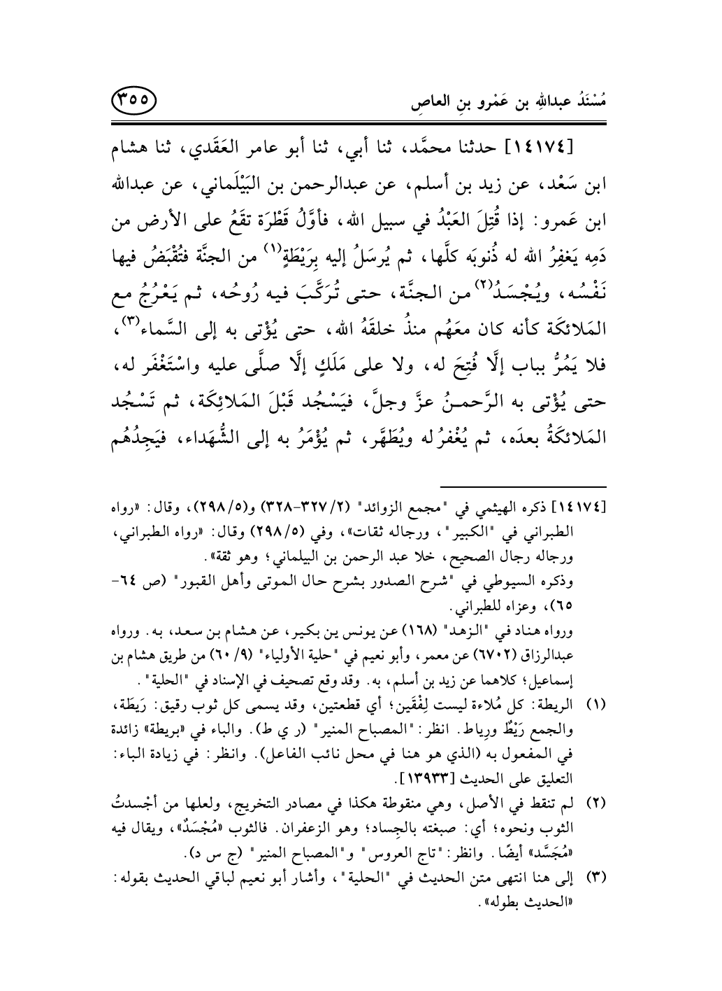 14174 - حدثنا محمَّد، ثنا أبي، ثنا أبو عامر العَقَدي، ثنا هشام ابن سَعْد، عن زيد بن أسلم، عن عبد الرحمن بن البَيْلَماني، عن عبد الله ابن عَمرو: إذا قُتِلَ العَبْدُ في سبيل الله، فأوَّلُ قَطْرَة تقَعُ على الأرض من دَمِه يَغفِرُ الله له ذُنوبَه كلَّها، ثم يُرسَلُ إليه بِرَيْطَةٍ (¬1) من الجنَّة فتُقْبَضُ فيها نَفْسُه، ويُجْسَدُ (¬2) من الجنَّة، حتى تُرَكَّبَ فيه رُوحُه، ثم يَعْرُجُ مع المَلائكَة كأنه كان معَهُم منذُ خلقَهُ الله، حتى يُؤْتى به إلى السَّماء (¬3) ، فلا يَمُرُّ بباب إلاَّ فُتِحَ له، ولا على مَلَكٍ إلاَّ صلَّى عليه واسْتَغْفَر له، حتى يُؤْتى به الرَّحمنُ عزَّ وجلَّ، فيَسْجُد قَبْلَ المَلائِكَة، ثم تَسْجُد المَلائكَةُ بعدَه، ثم يُغْفرُ له ويُطَهَّر، ثم يُؤْمَرُ به إلى الشُّهَداء، فيَجِدُهُم -[356]- في رياضٍ خُضْرٍ وثيابٍ من حَرير، عندهُم ثَوْرٌ وحُوتٌ يُلَغِّثَانهم (¬4) كل يوم بشيء لم يُلَغِّثَاهُ (¬5) بالأمس؛ يظَلُّ الحوتُ في أنهار الجَنَّة، فيأكلُ من كلِّ رائحَةٍ من أنهار الجنَّة، فإذا أمسى وَكَزَهُ الثورُ بقَرْنِه (¬6) ، فذَكَّاهُ، فأكلوا من لَحْمه، فوجَدوا في لَحْمه كلَّ رائحةٍ من أنهار الجنَّة. ويَبِيتُ الثورُ نافشًا (¬7) في الجنَّة يأكلُ من ثَمَر الجنَّة، فإذا أصبَحَ غَدا عليه الحُوتُ فذَكَّاهُ/ بذَنَبِه، فأكَلُوا من لَحْمه، ووجَدوا في طَعْمِ لَحْمِه طَعْمَ [خ: 311/ب]