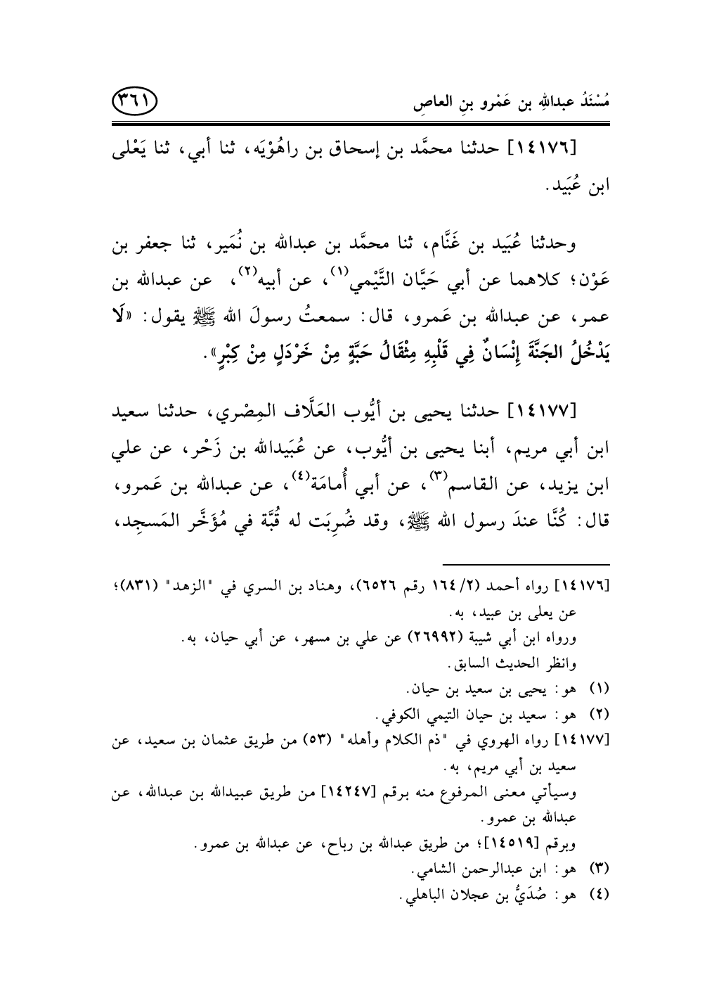 وبرقم [14519] ؛ من طريق عبد الله بن رباح، عن عبد الله بن عمرو.