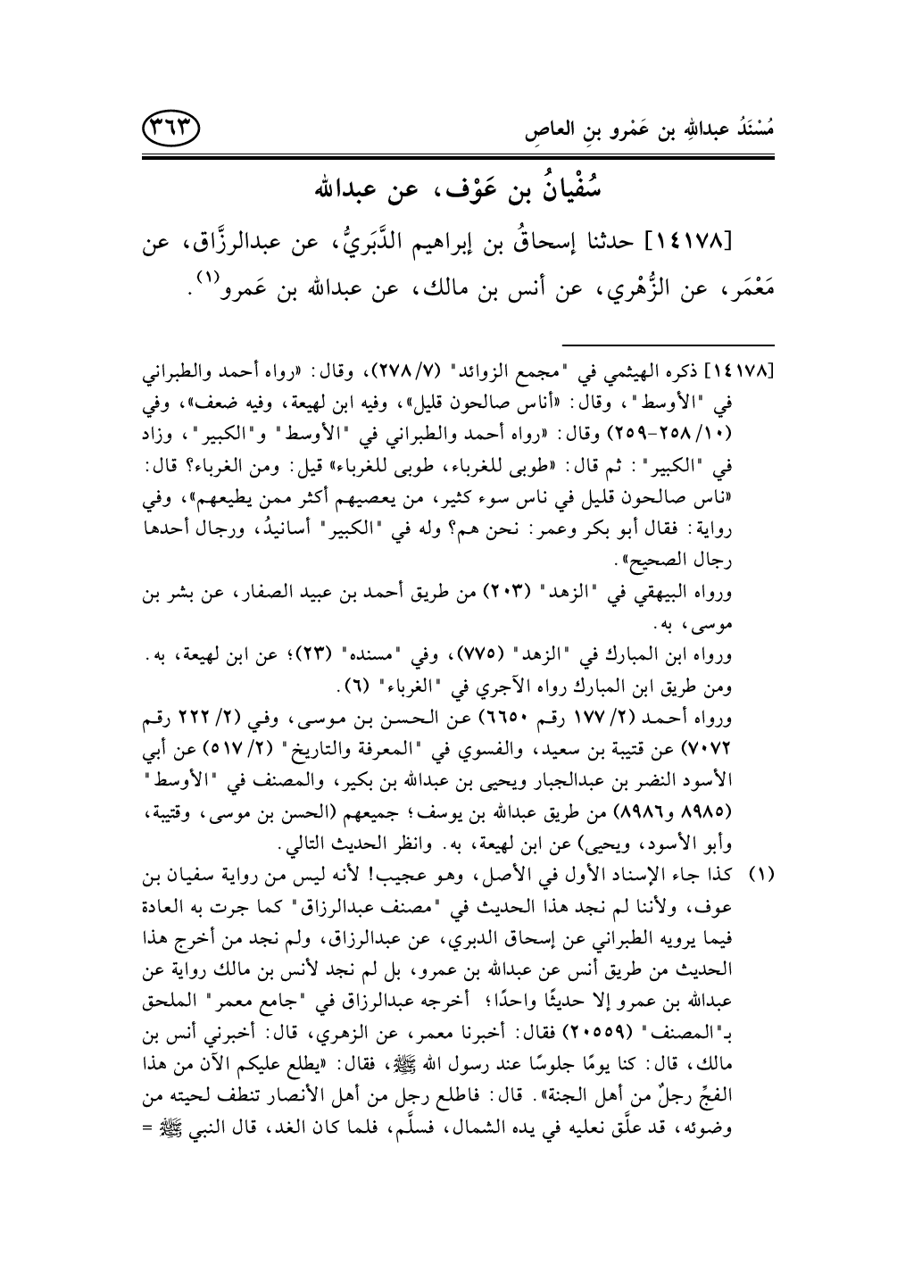 (¬1) كذا جاء الإسناد الأول في الأصل، وهو عجيب! لأنه ليس من رواية سفيان بن عوف، ولأننا لم نجد هذا الحديث في "مصنف عبد الرزاق" كما جرت به العادة فيما يرويه الطبراني عن إسحاق الدبري، عن عبد الرزاق، ولم نجد من أخرج هذا الحديث من طريق أنس عن عبد الله بن عمرو، بل لم نجد لأنس بن مالك رواية عن عبد الله بن عمرو إلا حديثًا واحدًا؛ أخرجه عبد الرزاق في "جامع معمر" الملحق بـ"المصنف" (20559) فقال: أخبرنا معمر، عن الزهري، قال: أخبرني أنس بن مالك، قال: كنا يومًا جلوسًا عند رسول الله صلى الله عليه وسلم، فقال: «يطلع عليكم الآن من هذا الفجِّ رجلٌ من أهل الجنة» . قال: فاطلع رجل من أهل الأنصار تنطف لحيته من وضوئه، قد علَّق نعليه في يده الشمال، فسلَّم، فلما كان الغد، قال النبي صلى الله عليه وسلم -[364]- مثل ذلك، فطلع ذلك الرجل على مثل المرة الأولى، فلما كان اليوم الثالث، قال النبي صلى الله عليه وسلم مثل مقالته أيضًا، فطلع ذلك الرجل على مثل حاله الأول، فلما قام النبي صلى الله عليه وسلم، تبعه عبد الله بن عمرو بن العاص فقال: إني لاحيت أبي، فأقسمت ألا أدخل عليه ثلاثًا، فإن رأيت أن تؤويني إليك حتى تمضي الثلاث فعلت، قال: نعم. قال أنس: كان عبد الله يحدث أنه بات معه ثلاث ليال، فلم يره يقوم من الليل شيئًا، غير أنه إذا تعارَّ انقلب على فراشه وذكر الله وكبر، حتى يقوم لصلاة الفجر. قال عبد الله: غير أني لم أسمعه يقول إلا خيرًا. فلما مضت الثلاث وكدت أحتقر عمله، قلت: يا عبد الله، لم يكن بيني وبين والدي هجرة ولا غضب، ولكني سمعت رسول الله صلى الله عليه وسلم يقول ثلاث مرات: «يطلع الآن عليكم رجل من أهل الجنة» فاطلعت ثلاث مرات، فأردت أن آوي إليك لأنظر ما عملك فأقتدي بك، فلم أرك تعمل كبير عمل، فما الذي بلغ بك ما قال رسول الله صلى الله عليه وسلم؟ قال: ما هو إلا ما رأيت. قال: فانصرفت عنه، فلما ولَّيت دعاني فقال: ما هو إلا ما رأيت، غير أني لا أجد في نفسي على أحدٍ من المسلمين غشًّا، ولا أحسده على ما أعطاه الله إياه إليه، فقال عبد الله: هذه التي بلغت بك، هي التي لا نطيق.