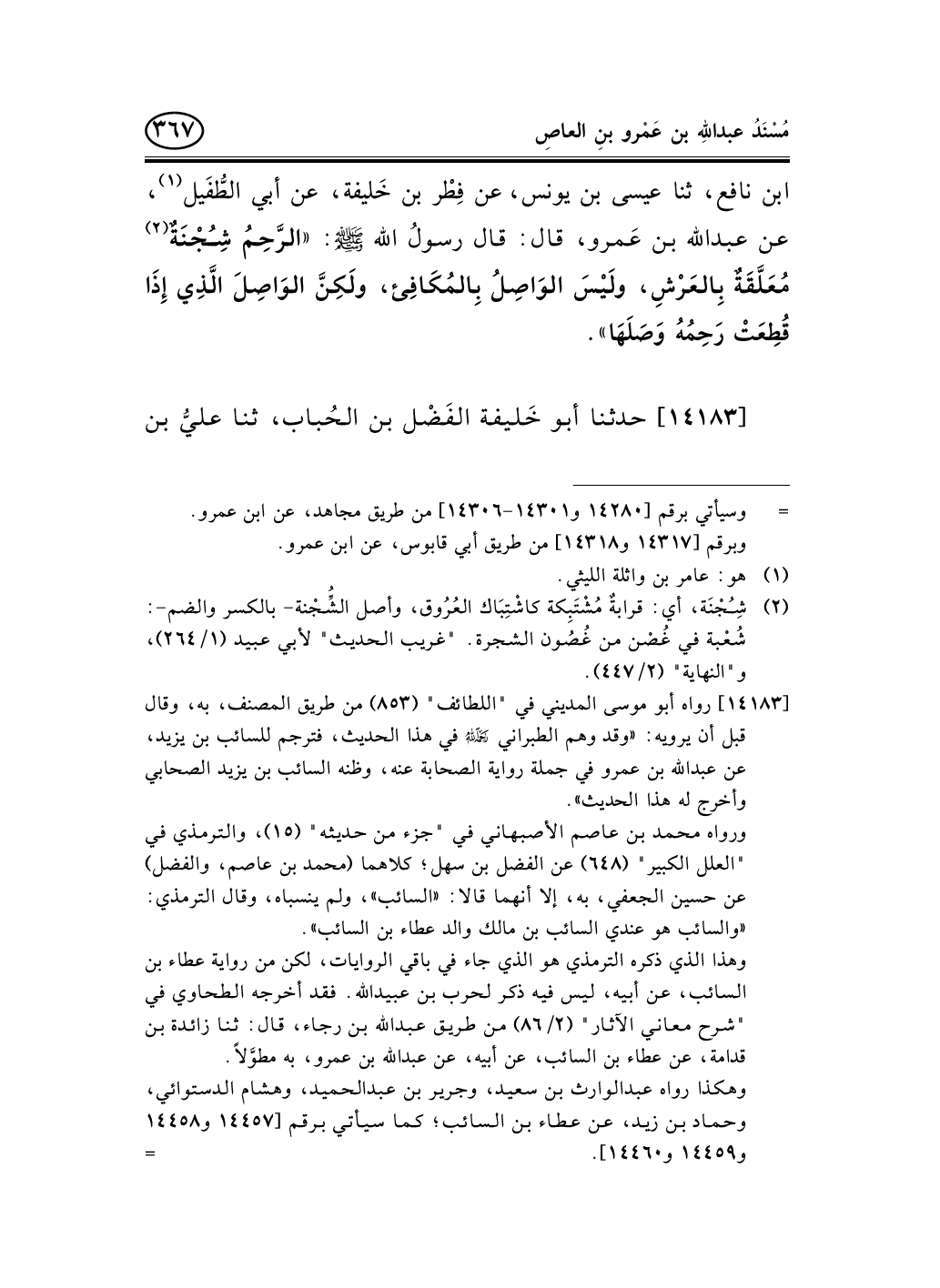 [14183] رواه أبو موسى المديني في "اللطائف" (853) من طريق المصنف، به، وقال قبل أن يرويه: «وقد وهم الطبراني _ح في هذا الحديث، فترجم للسائب بن يزيد، عن عبد الله بن عمرو في جملة رواية الصحابة عنه، وظنه السائب بن يزيد الصحابي وأخرج له هذا الحديث» .