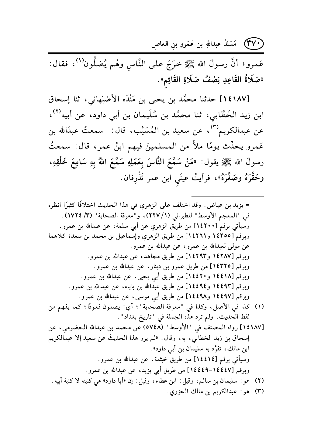 14187 - حدثنا محمَّد بن يحيى بن مَنْدَه الأصْبَهاني، ثنا إسحاق ابن زيد الخَطَّابي، ثنا محمَّد بن سُلَيمان بن أبي داود، عن أبيه (¬1) ، عن عبد الكريم (¬2) ، عن سعيد بن المُسَيَّب، قال: سمعتُ عبدَالله بن عَمرو يحدِّث يومًا ملأً من المسلمينَ فيهم ابنُ عمر، قال: سمعتُ رسولَ الله صلى الله عليه وسلم يقول: «مَنْ سَمَّعَ النَّاسَ بِعَمَلِهِ سَمَّعَ اللهُ بِهِ سَامِعَ خَلْقِهِ، وحَقَّرَهُ وصَغَّرَهُ» ، فرأيتُ عينَيِ ابن عمر تَذْرِفان.