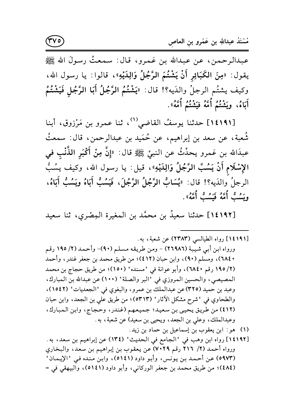 14191 - حدثنا يوسفُ القاضي (¬1) ، ثنا عمرو بن مَرْزوق، أبنا شُعبة، عن سعد بن إبراهيم، عن حُمَيد بن عبد الرحمن، قال: سمعتُ عبدَالله بن عَمرو يحدِّثُ عن النبيِّ صلى الله عليه وسلم قال: «إِنَّ مِنْ أَكْبَرِ الذَّنْبِ في الإِسْلاَمِ أَنْ يَسُبَّ الرَّجُلُ وَالِدَيْهِ» ، قيل: يا رسول الله، وكيف يسُبُّ الرجلُ والدَيه؟! قال: «يُسَابُّ الرَّجُلُ الرَّجُلَ، فَيَسُبُّ أَبَاهُ ويَسُبُّ أَبَاهُ، ويَسُبُّ أُمَّهُ فَيَسُبُّ أُمَّهُ» .