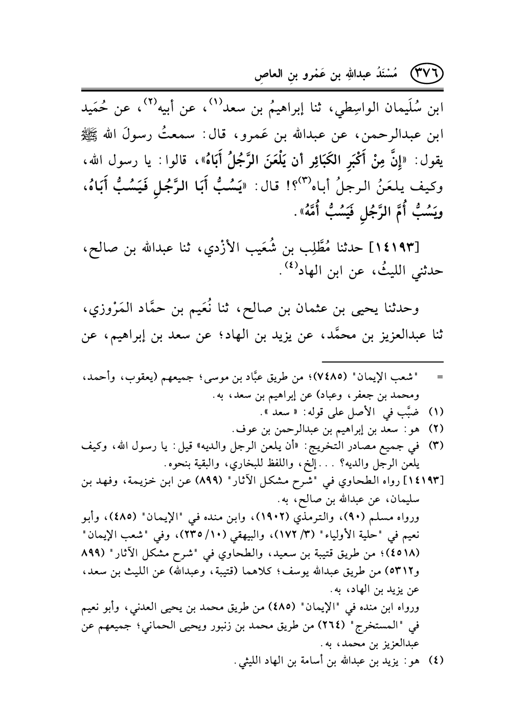 وحدثنا يحيى بن عثمان بن صالح، ثنا نُعَيم بن حمَّاد المَرْوزي، ثنا عبد العزيز بن محمَّد، عن يزيد بن الهاد؛ عن سعد بن إبراهيم، عن -[377]- حُمَيد بن عبد الرحمن، عن عبد الله بن عَمرو بن العاص، أنه سمعَ رسولَ الله صلى الله عليه وسلم يقول: «مِنْ أَكْبَرِ الكَبَائِرِ شَتْمُ الرَّجُلِ وَالِدَيْهِ» ، قالوا: يا رسول الله، وهل يشتُم الرجلُ والدَيه؟! قال: «نَعَمْ؛ يَسُبُّ أَبَا الرَّجُلِ فَيَسُبُّ أَبَاهُ، ويَسُبُّ أُمَّهُ فَيَسُبُّ أُمَّهُ» .