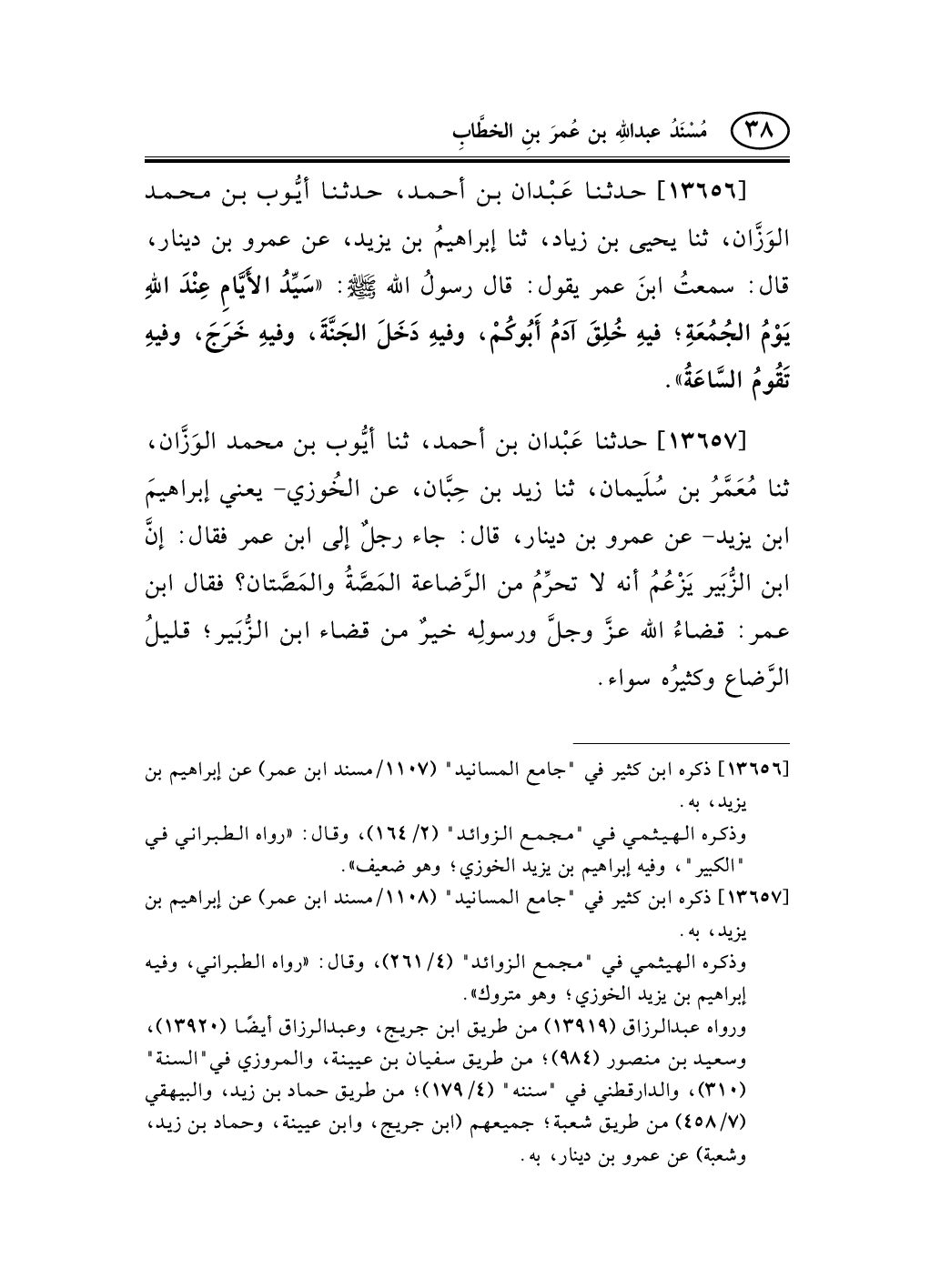 13656 - حدثنا عَبْدان بن أحمد، حدثنا أيُّوب بن محمد الوَزَّان، ثنا يحيى بن زياد، ثنا إبراهيمُ بن يزيد، عن عمرو بن دينار، قال: سمعتُ ابنَ عمر يقول: قال رسولُ الله صلى الله عليه وسلم: «سَيِّدُ الأَيَّامِ عِنْدَ اللهِ يَوْمُ الجُمُعَةِ؛ فيهِ خُلِقَ آدَمُ أَبُوكُمْ، وفيهِ دَخَلَ الجَنَّةَ، وفيهِ خَرَجَ، وفيهِ تَقُومُ السَّاعَةُ» .
