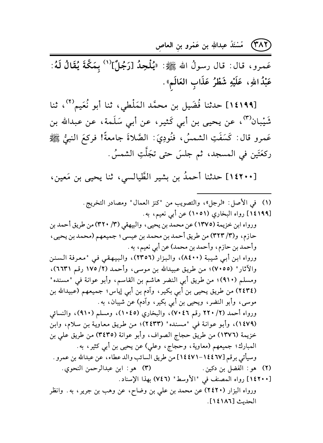 14199 - حدثنا فُضَيل بن محمَّد المَلْطي، ثنا أبو نُعَيم (¬1) ، ثنا شَيْبان (¬2) ، عن يحيى بن أبي كَثير، عن أبي سَلَمة، عن عبد الله بن عَمرو قال: كَسَفَتِ الشمسُ، فنُودِيَ: الصَّلاةَ جامعةً! فركعَ النبيُّ صلى الله عليه وسلم ركعَتَين في المسجد، ثم جلسَ حتى تجَلَّتِ الشمسُ.