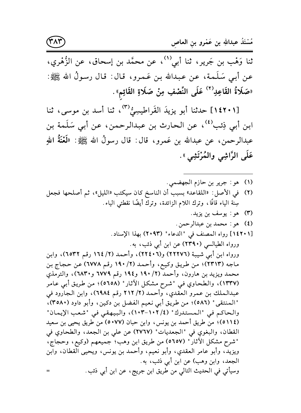 14201 - حدثنا أبو يزيدَ القَراطيسِيُّ (¬1) ، ثنا أسد بن موسى، ثنا ابن أبي ذِئب (¬2) ، عن الحارث بن عبد الرحمن، عن أبي سَلَمة بن عبد الرحمن، عن عبد الله بن عَمرو، قال: قال رسولُ الله صلى الله عليه وسلم: «لَعْنَةُ اللهِ عَلَى الرَّاشِي والمُرْتَشِي» .