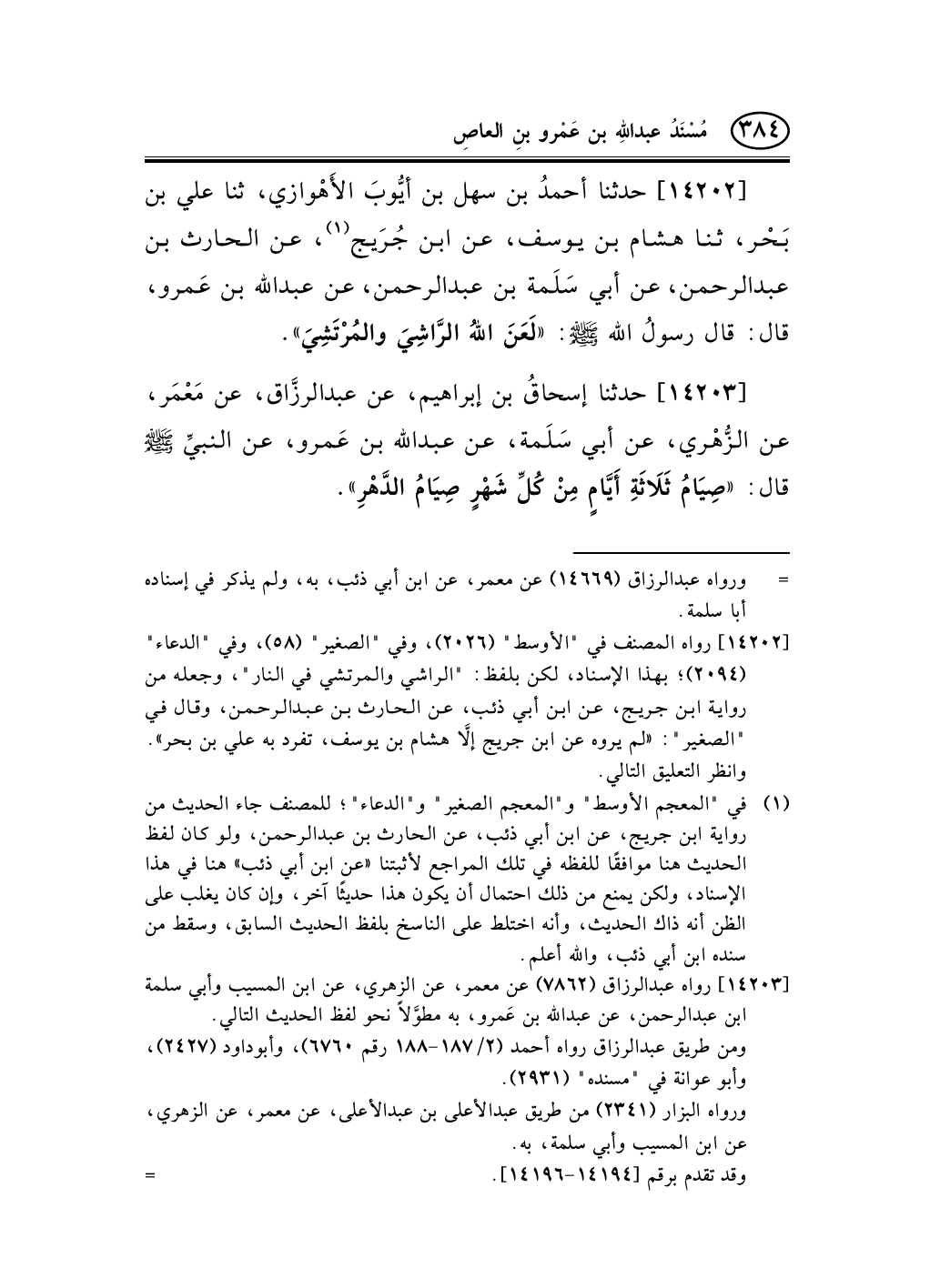 14202 - حدثنا أحمدُ بن سهل بن أيُّوبَ الأَهْوازي، ثنا علي بن بَحْر، ثنا هشام بن يوسف، عن ابن جُرَيج (¬1) ، عن الحارث بن عبد الرحمن، عن أبي سَلَمة بن عبد الرحمن، عن عبد الله بن عَمرو، قال: قال رسولُ الله صلى الله عليه وسلم: «لَعَنَ اللهُ الرَّاشِيَ والمُرْتَشِيَ» .