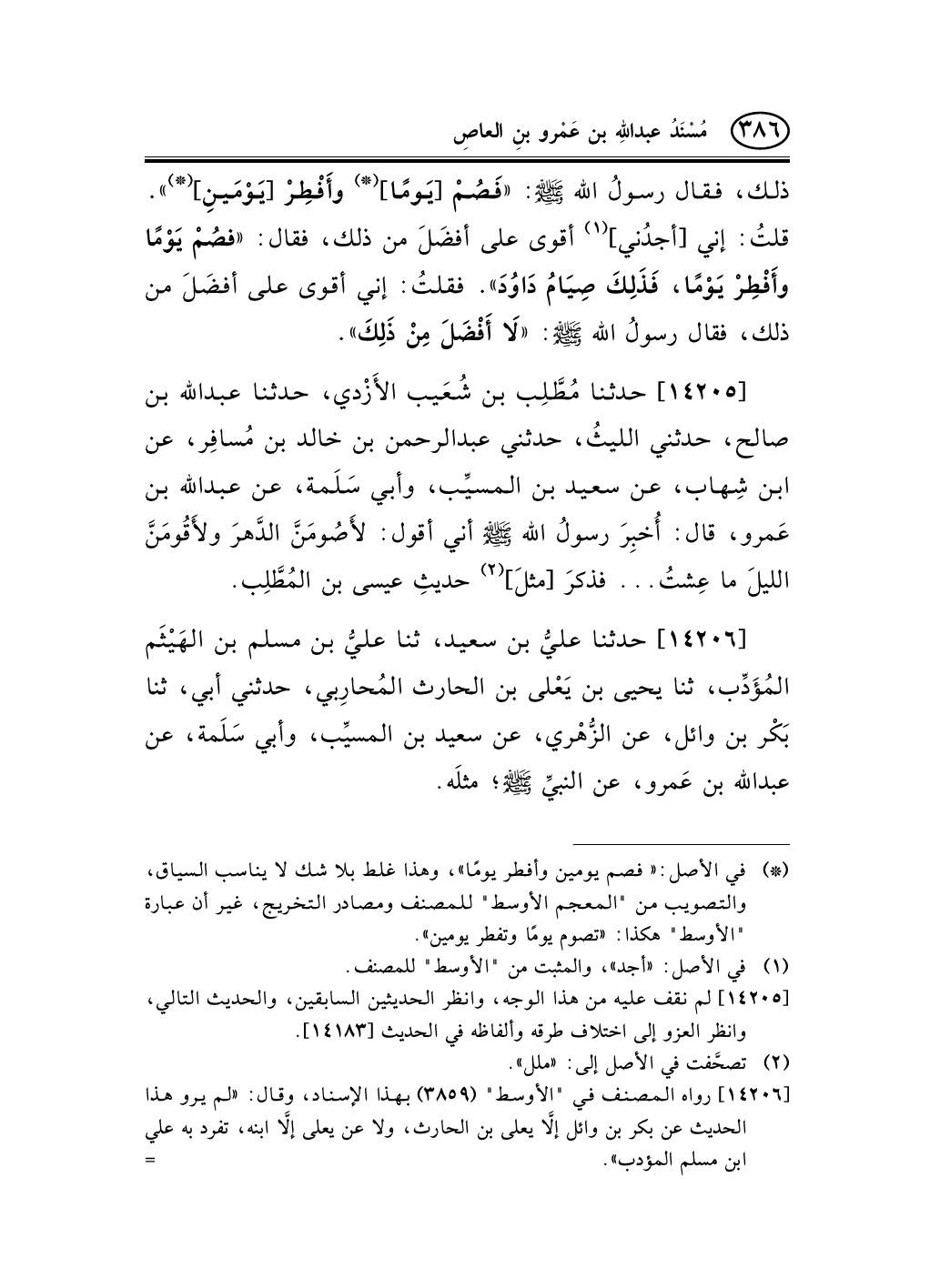 14205 - حدثنا مُطَّلِب بن شُعَيب الأَزْدي، حدثنا عبد الله بن صالح، حدثني الليثُ، حدثني عبد الرحمن بن خالد بن مُسافِر، عن ابن شِهاب، عن سعيد بن المسيِّب، وأبي سَلَمة، عن عبد الله بن عَمرو، قال: أُخبِرَ رسولُ الله صلى الله عليه وسلم أني أقول: لأَصُومَنَّ الدَّهرَ ولأَقُومَنَّ الليلَ ما عِشتُ ... فذكرَ [مثلَ] (¬1) حديثِ عيسى بن المُطَّلِب.