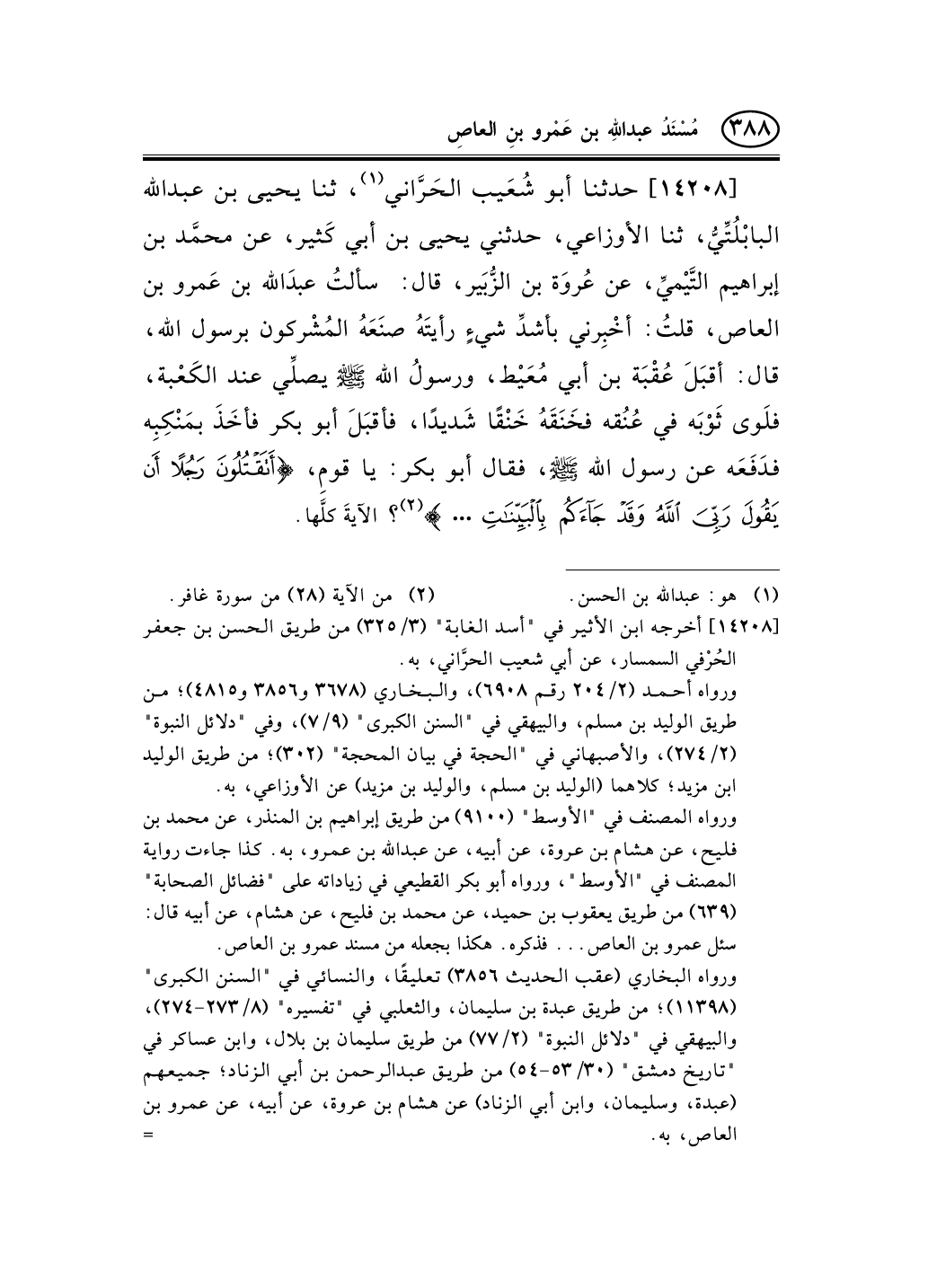 14208 - حدثنا أبو شُعَيب الحَرَّاني (¬1) ، ثنا يحيى بن عبد الله البابْلُتِّيُّ، ثنا الأوزاعي، حدثني يحيى بن أبي كَثير، عن محمَّد بن إبراهيم التَّيْميِّ، عن عُروَة بن الزُّبَير، قال: سألتُ عبدَالله بن عَمرو بن العاص، قلتُ: أخْبِرني بأشدِّ شيءٍ رأيتَهُ صنَعَهُ المُشْركون برسول الله، قال: أقبَلَ عُقْبَة بن أبي مُعَيْط، ورسولُ الله صلى الله عليه وسلم يصلِّي عند الكَعْبة، فلَوى ثَوْبَه في عُنُقه فخَنَقَهُ خَنْقًا شَديدًا، فأقبَلَ أبو بكر فأخَذَ بمَنْكِبِه فدَفَعَه عن رسول الله صلى الله عليه وسلم، فقال أبو بكر: يا قومِ، {أَتَقْتُلُونَ رَجُلاً أَنْ يَقُولَ رَبِّيَ اللَّهُ وَقَدْ جَاءَكُمْ بِالْبَيِّنَاتِ} (¬2) ؟ الآيةَ كلَّها.