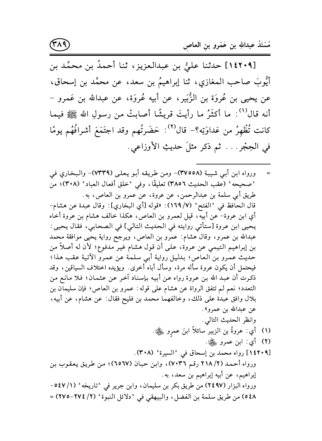 14209 - حدثنا عليُّ بن عبد العزيز، ثنا أحمدُ بن محمَّد بن أيُّوبَ صاحب المغازي، ثنا إبراهيمُ بن سعد، عن محمَّد بن إسحاق، عن يحيى بن عُروَة بن الزُّبَير، عن أبيه عُروَة، عن عبد الله بن عَمرو - أنه قال (¬1) : ما أكثَرُ ما رأيتَ قريشًا أصابتْ من رسولِ الله صلى الله عليه وسلم فيما كانت تُظْهِرُ من عَداوَتِه؟ - قال (¬2) : حَضَرتُهم وقد اجتَمَعَ أشرافُهُم يومًا في الحِجْر ... ثم ذكر مثلَ حديثِ الأوزاعي.