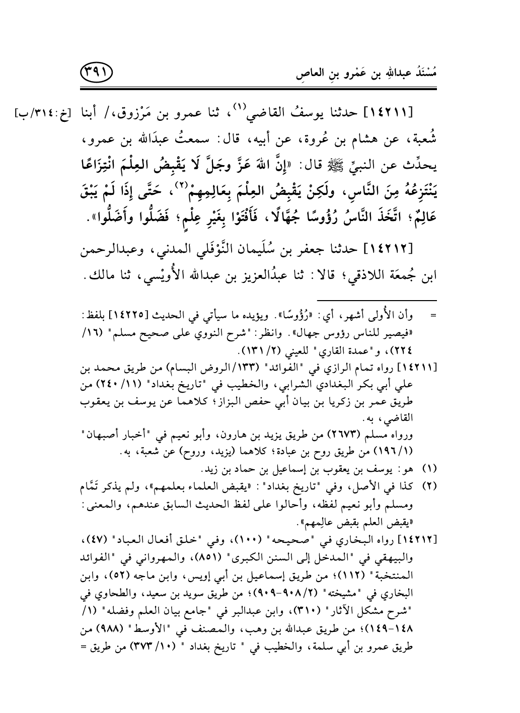 14211 - حدثنا يوسفُ القاضي (¬1) ، ثنا عمرو بن مَرْزوق، / أبنا شُعبة، عن هشام بن عُروة، عن أبيه، قال: سمعتُ عبدَالله بن عمرو، يحدِّث عن النبيِّ صلى الله عليه وسلم قال: «إِنَّ اللهَ عَزَّ وجَلَّ لاَ يَقْبِضُ العِلْمَ انْتِزَاعًا يَنْتَزِعُهُ مِنَ النَّاسِ، ولَكِنْ يَقْبِضُ العِلْمَ بِعَالِمِهِمْ (¬2) ، حَتَّى إِذَا لَمْ يَبْقَ عَالِمٌ؛ اتَّخَذَ النَّاسُ رُؤُوسًا جُهَّالاً، فَأَفْتَوْا بِغَيْرِ عِلْمٍ؛ فَضَلُّوا وأَضَلُّوا» .