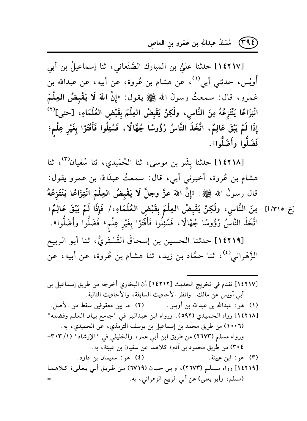 14217 - حدثنا عليُّ بن المبارك الصَّنْعاني، ثنا إسماعيلُ بن أبي أُويْس، حدثني أبي (¬1) ، عن هشام بن عُروة، عن أبيه، عن عبد الله بن عَمرو، قال: سمعتُ رسولَ الله صلى الله عليه وسلم يقول: «إِنَّ اللهَ لاَ يَقْبِضُ العِلْمَ انْتِزَاعًا يَنْتَزِعُهُ مِنَ النَّاسِ، ولَكِنْ يَقْبِضُ العِلْمَ بِقَبْضِ العُلَمَاءِ، [حتى] (¬2) إِذَا لَمْ يَبْقَ عَالِمٌ، اتَّخَذَ النَّاسُ رُؤُوسًا جُهَّالاً، فَسُئِلُوا فَأَفْتَوْا بِغَيْرِ عِلْمٍ؛ فَضَلُّوا وأَضَلُّوا» .