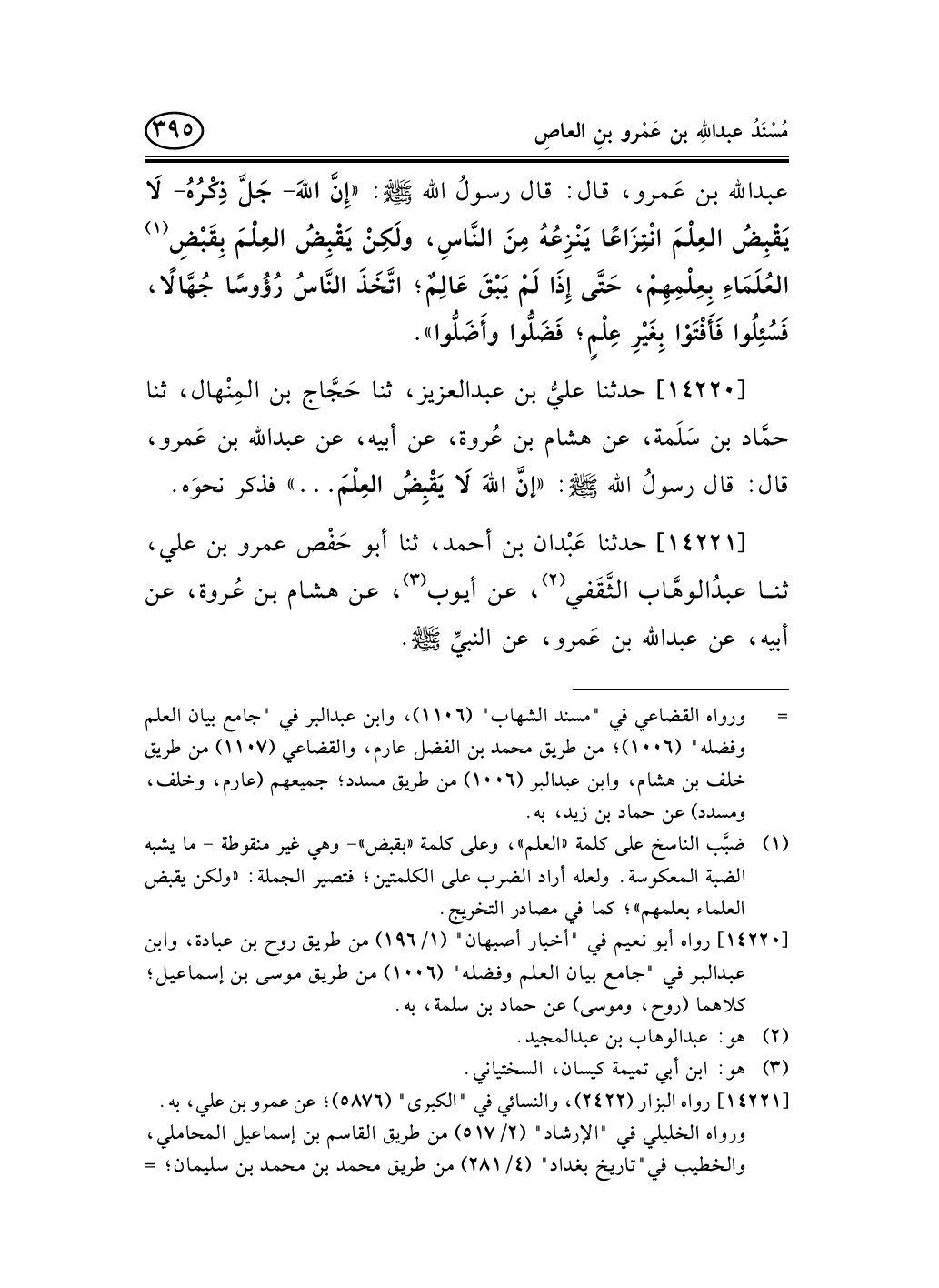 14220 - حدثنا عليُّ بن عبد العزيز، ثنا حَجَّاج بن المِنْهال، ثنا حمَّاد بن سَلَمة، عن هشام بن عُروة، عن أبيه، عن عبد الله بن عَمرو، قال: قال رسولُ الله صلى الله عليه وسلم: «إنَّ اللهَ لاَ يَقْبِضُ العِلْمَ ... » فذكر نحوَه.