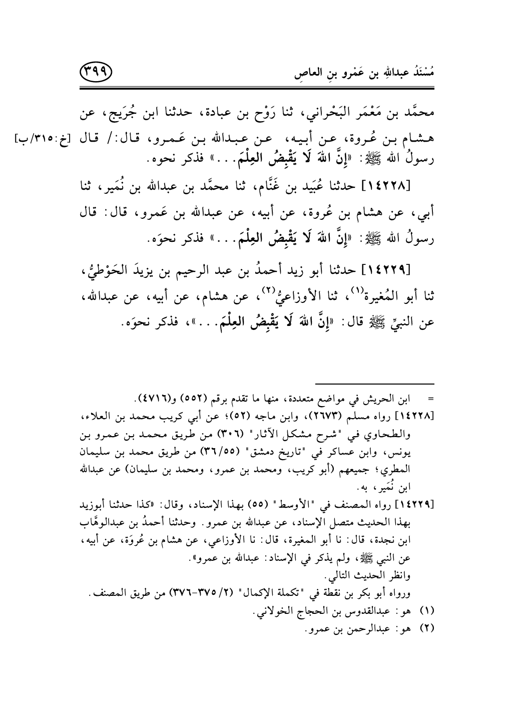 14229 - حدثنا أبو زيد أحمدُ بن عبد الرحيم بن يزيدَ الحَوْطيُّ، ثنا أبو المُغيرة (¬1) ، ثنا الأوزاعيُّ (¬2) ، عن هشام، عن أبيه، عن عبد الله، عن النبيِّ صلى الله عليه وسلم قال: «إِنَّ اللهَ لاَ يَقْبِضُ العِلْمَ ... » ، فذكر نحوَه.