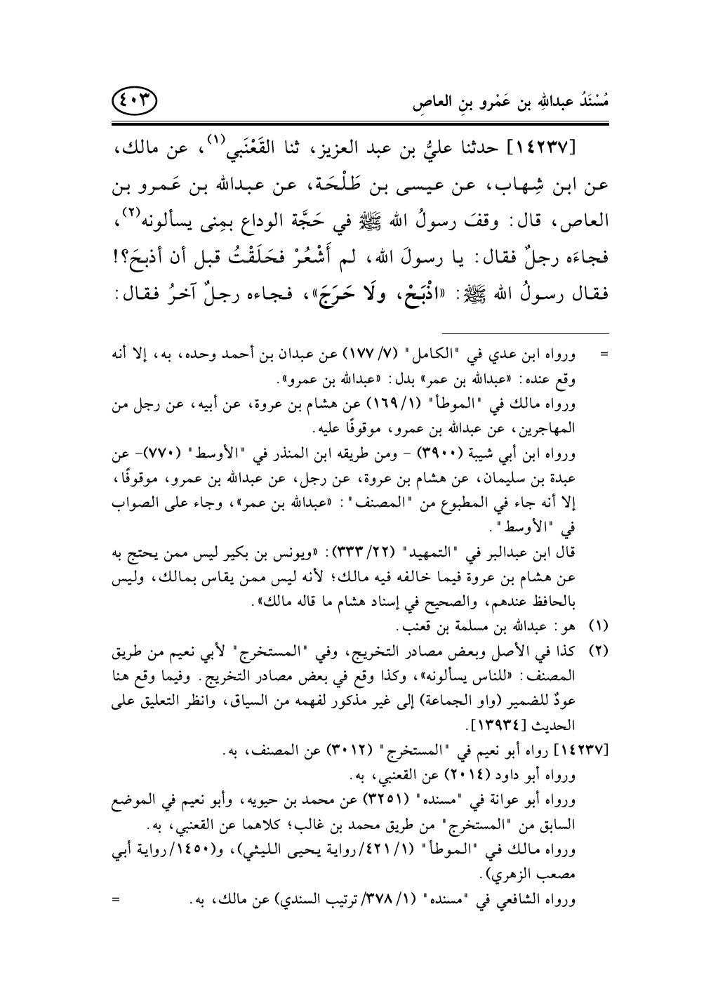 14237 - حدثنا عليُّ بن عبد العزيز، ثنا القَعْنَبي (¬1) ، عن مالك، عن ابن شِهاب، عن عيسى بن طَلْحَة، عن عبد الله بن عَمرو بن العاص، قال: وقفَ رسولُ الله صلى الله عليه وسلم في حَجَّة الوداع بمِنى يسألونه (¬2) ، فجاءََه رجلٌ فقال: يا رسولَ الله، لم أَشْعُرْ فحَلَقْتُ قبل أن أذبحَ؟! فقال رسولُ الله صلى الله عليه وسلم: «اذْبَحْ، ولاَ حَرَجَ» ، فجاءه رجلٌ آخرُ فقال: -[404]- يا رسولَ الله، لم أَشْعُرْ فنَحَرتُ قبل أن أرْميَ؟! قال: «ارْمِ، ولاَ حَرَجَ» ، قال: فما سُئل رسولُ الله صلى الله عليه وسلم عن شيءٍ قُدِّمَ ولا أُخِّرَ إلا قال: «افْعَل، ولا حَرَجَ» .