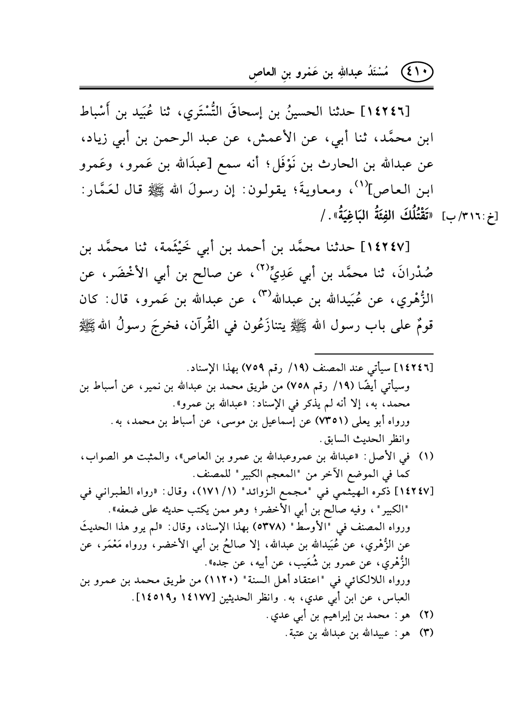 14246 - حدثنا الحسينُ بن إسحاقَ التُّسْتَري، ثنا عُبَيد بن أَسْباط ابن محمَّد، ثنا أبي، عن الأعمش، عن عبد الرحمن بن أبي زياد، عن عبد الله بن الحارث بن نَوْفَل؛ أنه سمع [عبدَالله بن عَمرو، وعَمرو ابن العاص] (¬1) ، ومعاويةَ؛ يقولون: إن رسولَ الله صلى الله عليه وسلم قال لعَمَّار: «تَقْتُلُكَ الفِئَةُ البَاغِيَةُ» . /