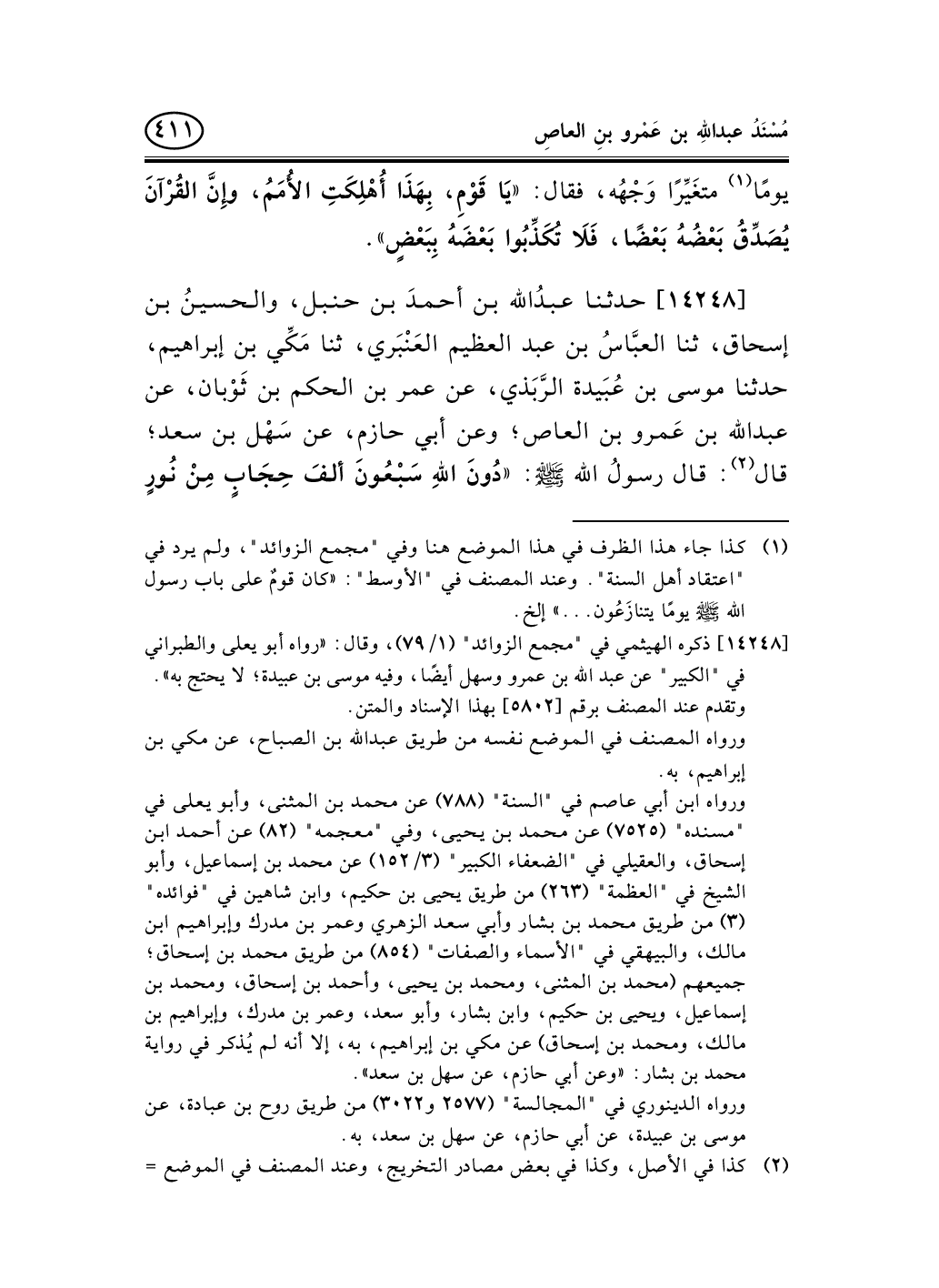 14248 - حدثنا عبدُالله بن أحمدَ بن حنبل، والحسينُ بن إسحاق، ثنا العبَّاسُ بن عبد العظيم العَنْبَري، ثنا مَكِّي بن إبراهيم، حدثنا موسى بن عُبَيدة الرَّبَذي، عن عمر بن الحكم بن ثَوْبان، عن عبد الله بن عَمرو بن العاص؛ وعن أبي حازم، عن سَهْل بن سعد؛ قال (¬1) : قال رسولُ الله صلى الله عليه وسلم: «دُونَ اللهِ سَبْعُونَ ألفَ حِجَابٍ مِنْ نُورٍ -[412]- وظُلْمَةٍ، فَمَا مِنْ نَفْسٍ تَسْمَعُ شَيْئًا مِنْ حِسِّ تِلْكَ الحُجُبِ إِلاَ زَهِقَتْ» .