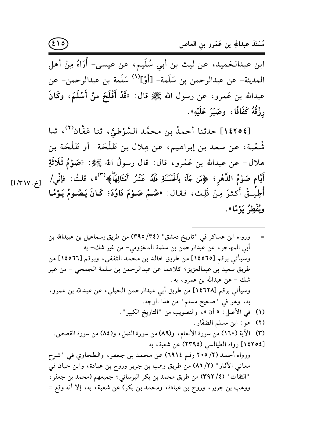14254 - حدثنا أحمدُ بن محمَّد السَّوْطيُّ، ثنا عَفَّان (¬1) ، ثنا شُعْبة، عن سعد بن إبراهيم، عن هِلال بن طَلْحَة- أو طَلْحَة بن هلال - عن عبد الله بن عَمْرو، قال: قال رسولُ الله صلى الله عليه وسلم: «صَوْمُ ثَلاَثَةِ أَيَّامٍ صَوْمُ الدَّهْرِ؛ (¬2) » ، قلتُ: فإنِّي/ أُطِيقُ أَكثرَ مِنْ ذَلِك، فقال: «صُمْ صَوْمَ دَاوُدَ؛ كَانَ يَصُومُ يَوْمًا ويُفْطِرُ يَوْمًا» .