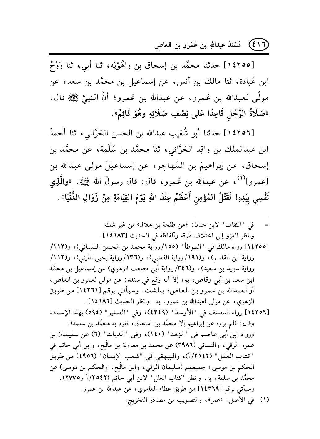 14255 - حدثنا محمَّد بن إسحاق بن راهُوْيَه، ثنا أبي، ثنا رَوْحُ ابن عُبادة، ثنا مالك بن أنس، عن إسماعيل بن محمَّد بن سعد، عن مولًى لعبد الله بن عَمرو، عن عبد الله بن عَمرو؛ أنَّ النبيَّ صلى الله عليه وسلم قال: «صَلاَةُ الرَّجُلِ قَاعِدًا عَلى نِصْفِ صَلاَتِهِ وهُوَ قَائِمٌ» .