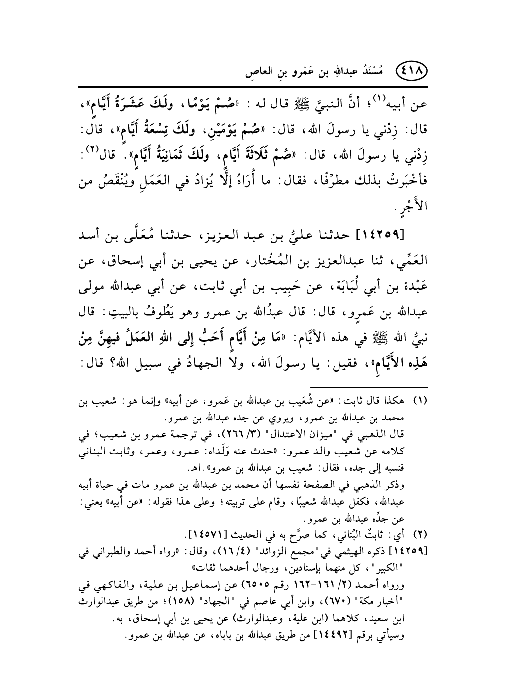 14259 - حدثنا عليُّ بن عبد العزيز، حدثنا مُعَلَّى بن أسد العَمِّي، ثنا عبد العزيز بن المُخْتار، عن يحيى بن أبي إسحاق، عن عَبْدة بن أبي لُبَابَة، عن حَبِيب بن أبي ثابت، عن أبي عبد الله مولى عبد الله بن عَمرٍو، قال: قال عبدُالله بن عمرو وهو يَطُوفُ بالبيتِ: قال نبيُّ الله صلى الله عليه وسلم في هذه الأيَّام: «مَا مِنْ أَيَّامٍ أَحَبُّ إِلى اللهِ العَمَلُ فيهِنَّ مِنْ هَذِه الأَيَّامِ» ، فقيل: يا رسولَ الله، ولا الجهادُ في سبيل الله؟ قال: -[419]- «ولاَ الجِهَادُ في سَبِيلِ اللهِ، إِلاَّ مَنْ خَرَجَ بِنَفْسِهِ ومَالِهِ ثُمَّ لَمْ يَرْجِعْ حَتَّى يُهَرَاقَ (¬1) دَمُهُ» . قال يحيى: فلقيتُ حبيبَ بن أبي ثابت وسألتُه؟ فحدَّثَ نحوًا من هذا، فقيل ليحيى: لم يُخَالِفْهُ؟ قال: لا، وحدَّثَني أنها أيَّامُ العَشْر.