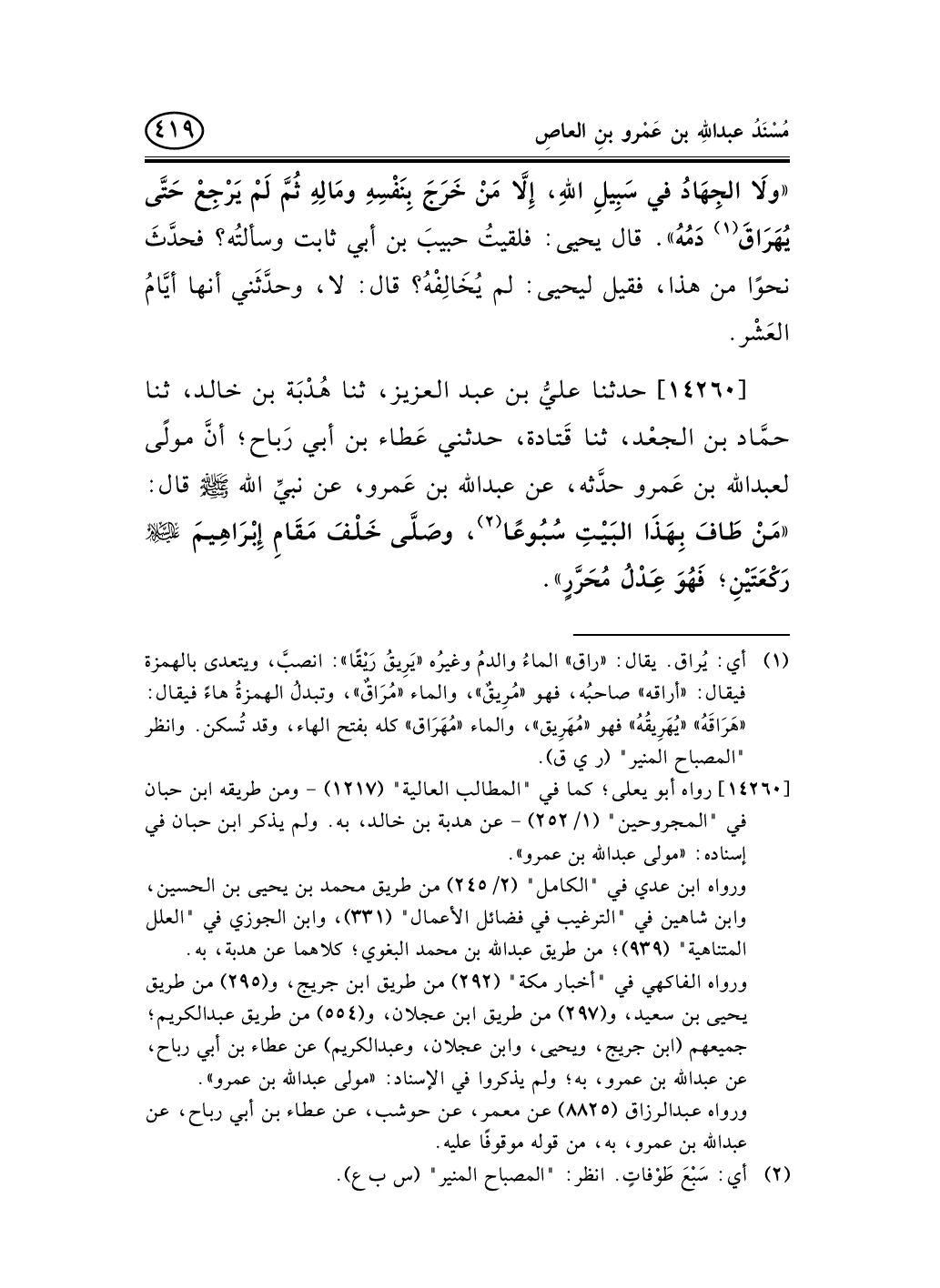 14260 - حدثنا عليُّ بن عبد العزيز، ثنا هُدْبَة بن خالد، ثنا حمَّاد بن الجعْد، ثنا قَتادة، حدثني عَطاء بن أبي رَباح؛ أنَّ مولًى لعبد الله بن عَمرو حدَّثه، عن عبد الله بن عَمرو، عن نبيِّ الله صلى الله عليه وسلم قال: «مَنْ طَافَ بِهَذَا البَيْتِ سُبُوعًا (¬1) ، وصَلَّى خَلْفَ مَقَامِ إِبْرَاهِيمَ _ج رَكْعَتَيْنِ؛ فَهُوَ عَِدْلُ مُحَرَّرٍ» .