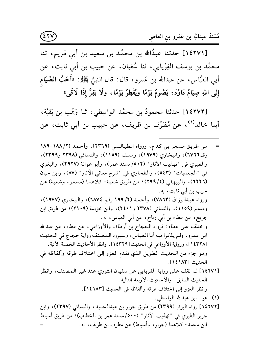 14271 - حدثنا عبدُالله بن محمَّد بن سعيد بن أبي مَريم، ثنا محمَّد بن يوسف الفِرْيابي، ثنا سُفيان، عن حبيب بن أبي ثابت، عن أبي العبَّاس، عن عبد الله بن عَمرو، قال: قال النبيُّ صلى الله عليه وسلم: «أَحَبُّ الصِّيَامِ إِلى اللهِ صِيَامُ دَاوُدَ؛ يَصُومُ يَوْمًا ويُفْطِرُ يَوْمًا، ولاَ يَفِرُّ إِذَا لاَقَى» .