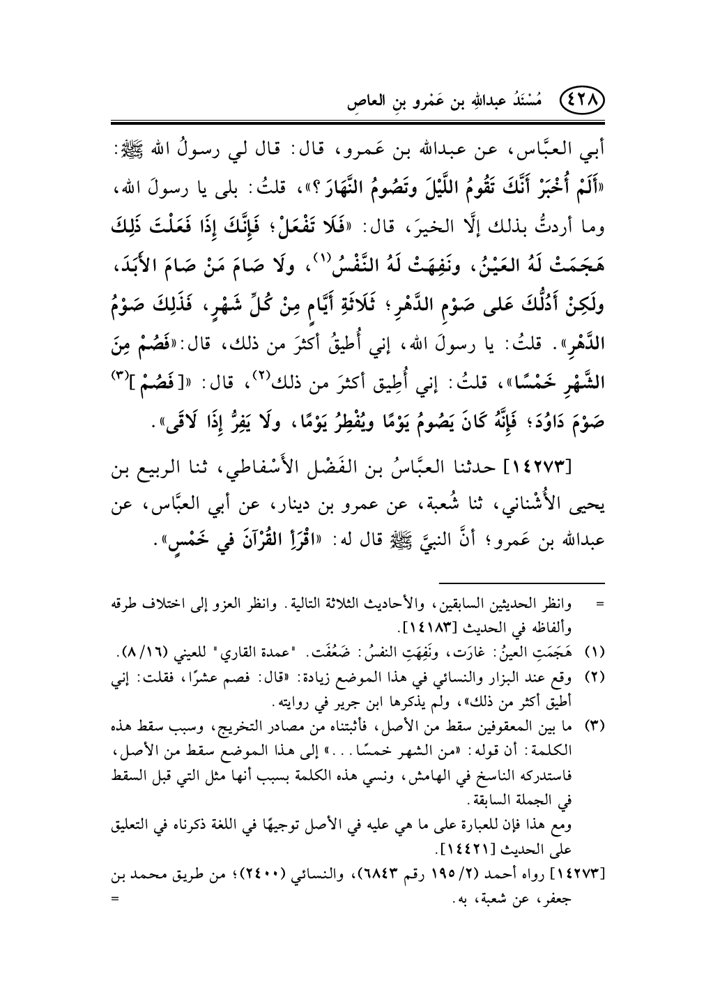 14273 - حدثنا العبَّاسُ بن الفَضْل الأَسْفاطي، ثنا الربيع بن يحيى الأُشْناني، ثنا شُعبة، عن عمرو بن دينار، عن أبي العبَّاس، عن عبد الله بن عَمرو؛ أنَّ النبيَّ صلى الله عليه وسلم قال له: «اقْرَأِ القُرْآنَ في خَمْسٍ» .