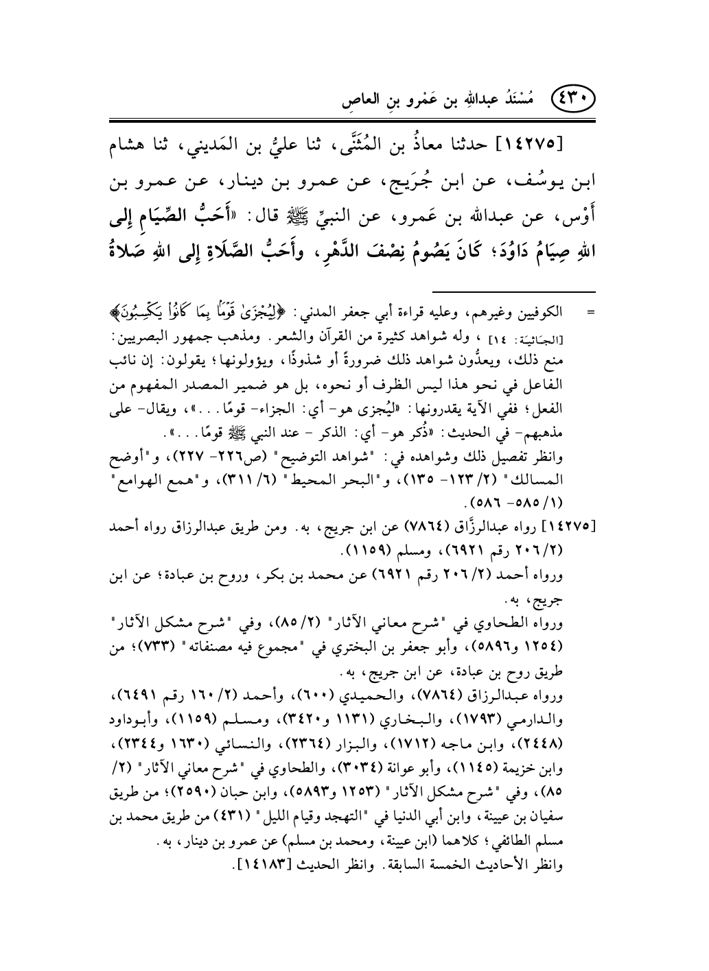 14275 - حدثنا معاذُ بن المُثَنَّى، ثنا عليُّ بن المَديني، ثنا هشام ابن يوسُف، عن ابن جُرَيج، عن عمرو بن دينار، عن عمرو بن أَوْس، عن عبد الله بن عَمرو، عن النبيِّ صلى الله عليه وسلم قال: «أَحَبُّ الصِّيَامِ إِلى اللهِ صِيَامُ دَاوُدَ؛ كَانَ يَصُومُ نِصْفَ الدَّهْرِ، وأَحَبُّ الصَّلاَةِ إِلى اللهِ صَلاةُ -[431]- دَاوُدَ؛ كَانَ يَرْقُدُ شَطْرَ اللَّيْلِ، ويَقُومُ، ثُمَّ يَرْقُدُ [آخِرَهُ] (¬1) ؛ ثُمَّ يَقُومُ (¬2) ثُلُثَ اللَّيْلِ بَعْدَ شَطْرِهِ» .