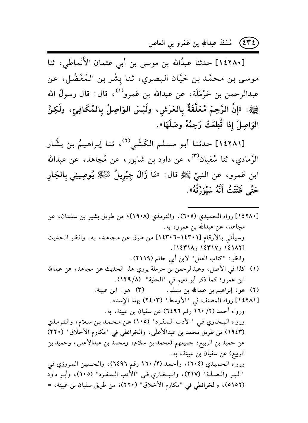 14280 - حدثنا عبدُالله بن موسى بن أبي عثمان الأَنْماطي، ثنا موسى بن محمَّد بن حَيَّان البصري، ثنا بِشْر بن المُفَضَّل، عن عبد الرحمن بن حَرْمَلَة، عن عبد الله بن عَمرو (¬1) ، قال: قال رسولُ الله صلى الله عليه وسلم: «إِنَّ الرَّحِمَ مُعَلَّقَةٌ بِالعَرْشِ، ولَيْسَ الوَاصِلُ بِالمُكَافِئِ، ولَكِنَّ الوَاصِلَ إِذا قُطِعَتْ رَحِمُهُ وصَلَهَا» .